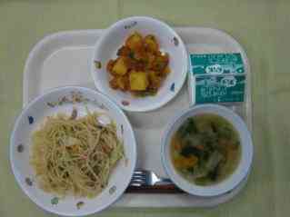 和風スパゲティ 野菜スープ ミートソースポテト 牛乳