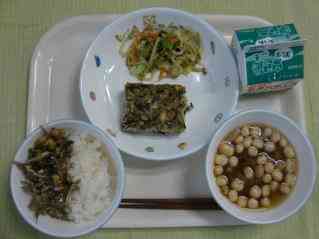 ご飯 豆じゃこ みそ汁 ぎせい豆腐 焼き豚カレー温やさい 牛乳