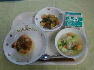 手作りピザパン ウインナーポトフ 揚げボールの煮物 牛乳