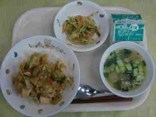 家常豆腐丼 冬瓜のスープ もやしの炒め物 牛乳