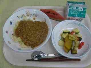 キーマーカレー 夏野菜のゴロゴログリル 小玉すいか 牛乳