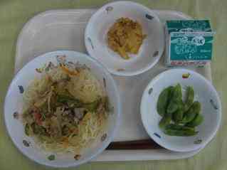 焼きそばチンジャオロース パンプキンボール 枝豆の塩ゆで 牛乳