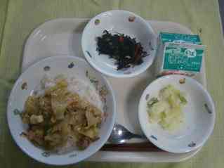 中華うま煮丼 じゃが芋のバター煮 ひじきの炒め物 牛乳