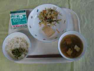 ご飯 じゃこピーマン 実だくさん汁 いかのみそ焼き 温野菜 牛乳