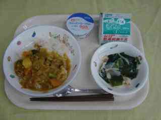 夏野菜玉ねぎカレーライス ボイル野菜 和風ドレッシング フローズンヨーグルト 牛乳