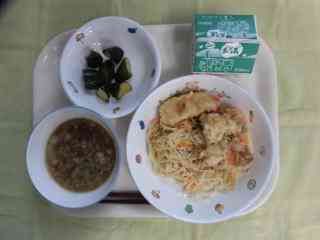 つけめん 天ぷら(いか・ちくわ) きゅうりの変り漬け 牛乳