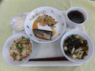 炊き込みおこわ 若竹汁 さんまの梅煮 温野菜 梨 麦茶