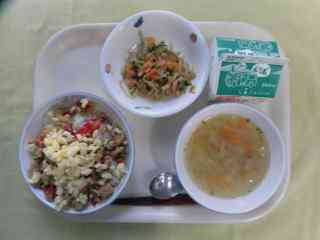 ガバオライス コンソメスープ 切干大根のサッと煮 牛乳