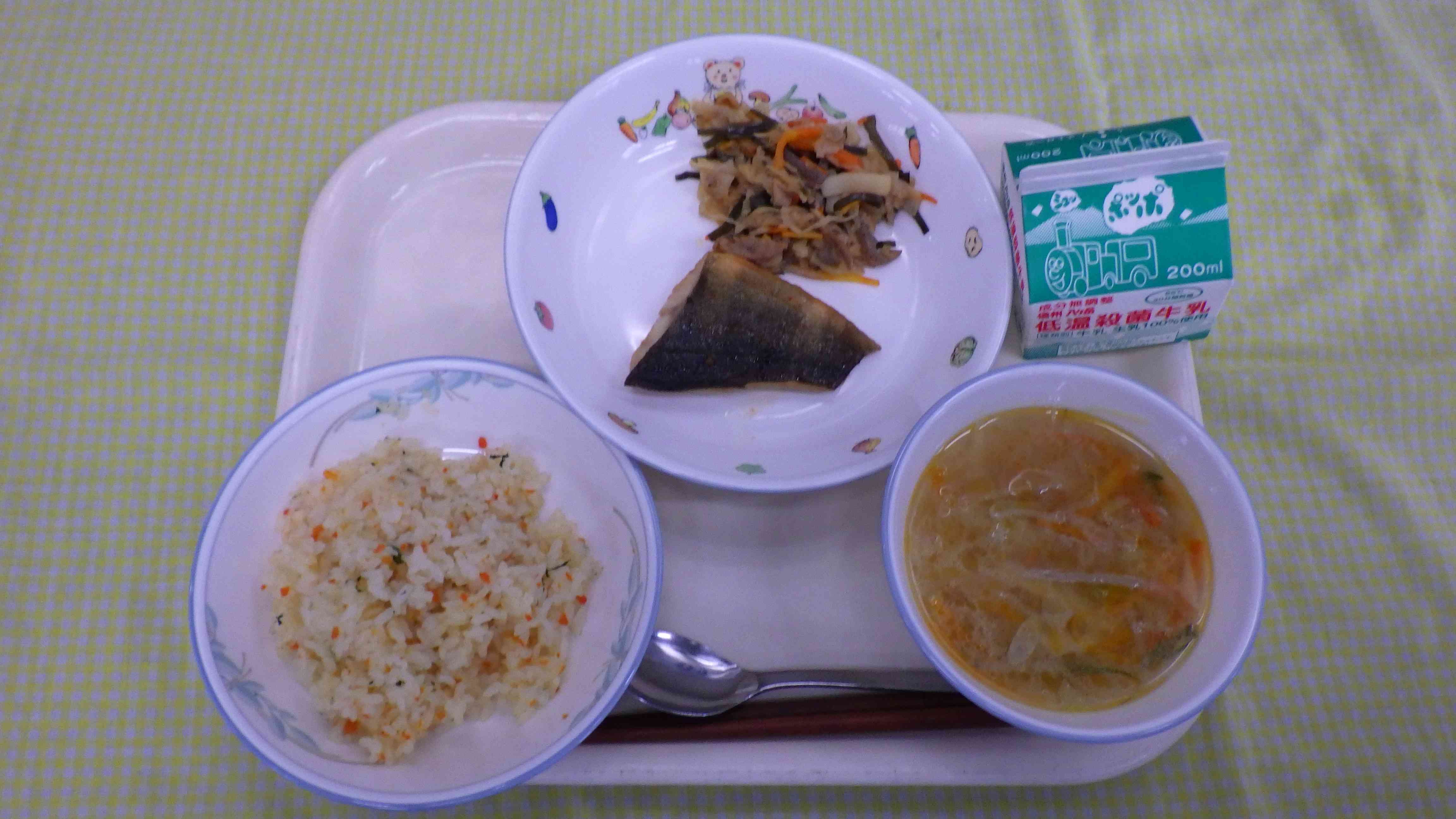 にんにくライス 中華スープ ほっけの香味焼き 千切りイリチー 牛乳