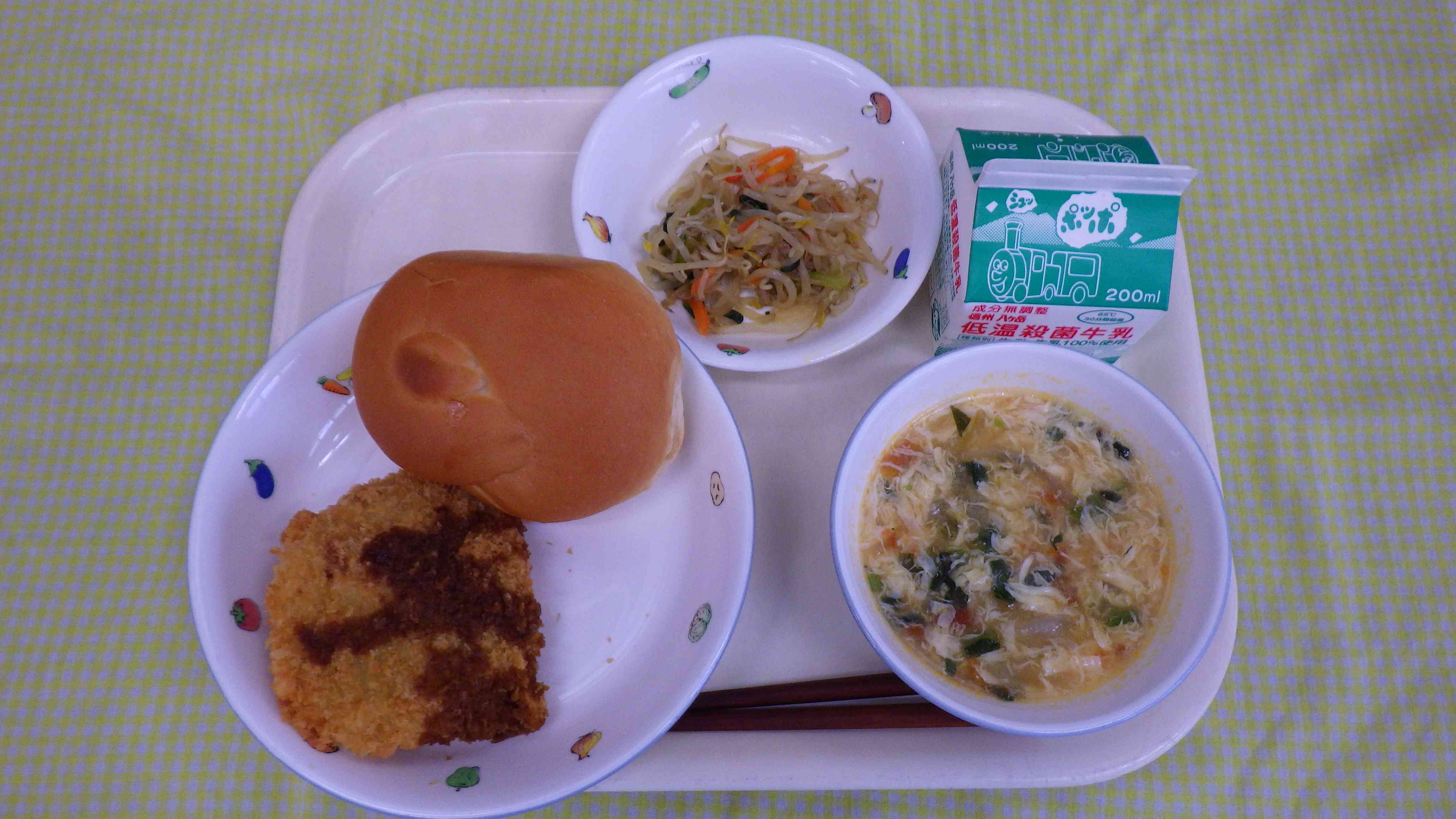 ミルクパン 卵とトマトのスープ カレーコロッケ 温野菜 牛乳