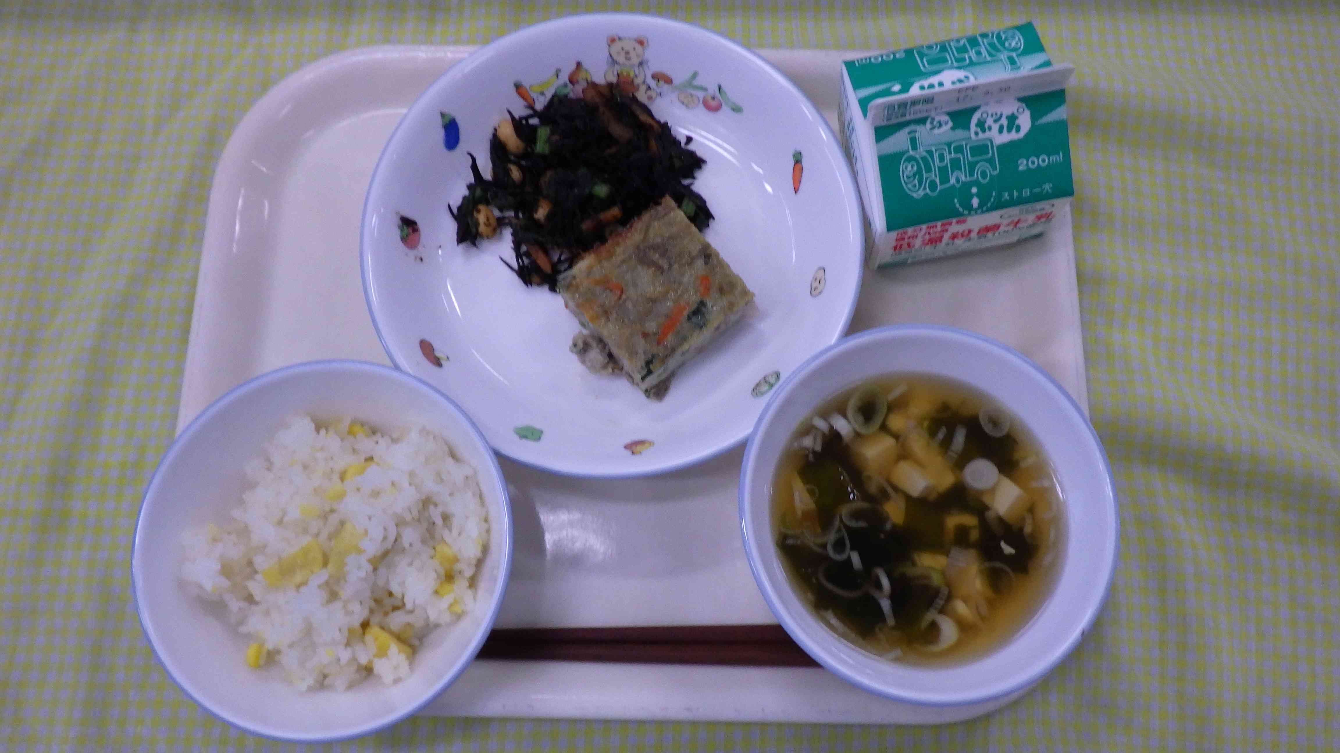 栗ごはん 若竹汁 和風厚焼き卵 ひじきと大豆の煮もの 牛乳