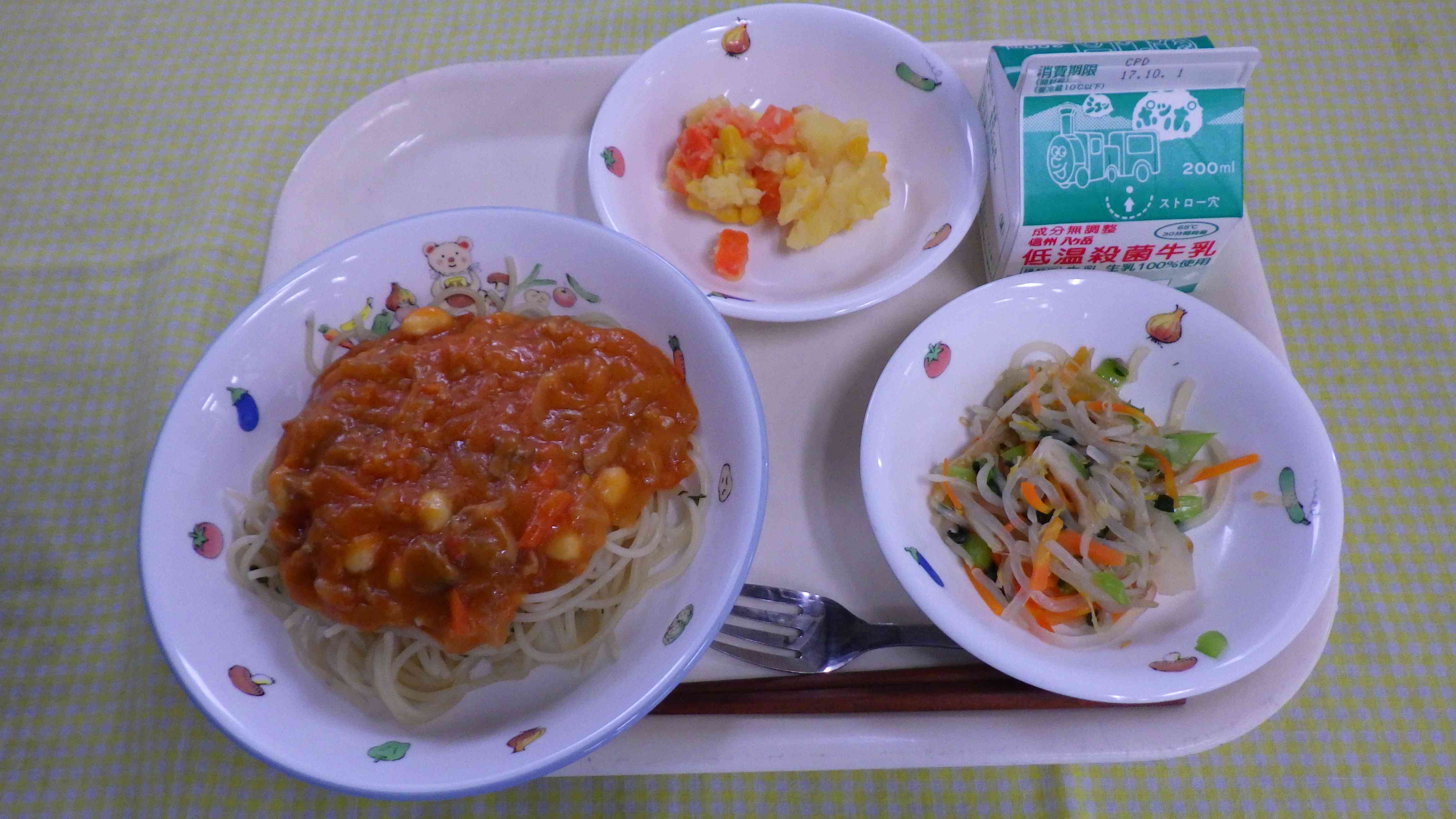スパゲティポークビーンズ 三色煮 野菜ソテー 牛乳