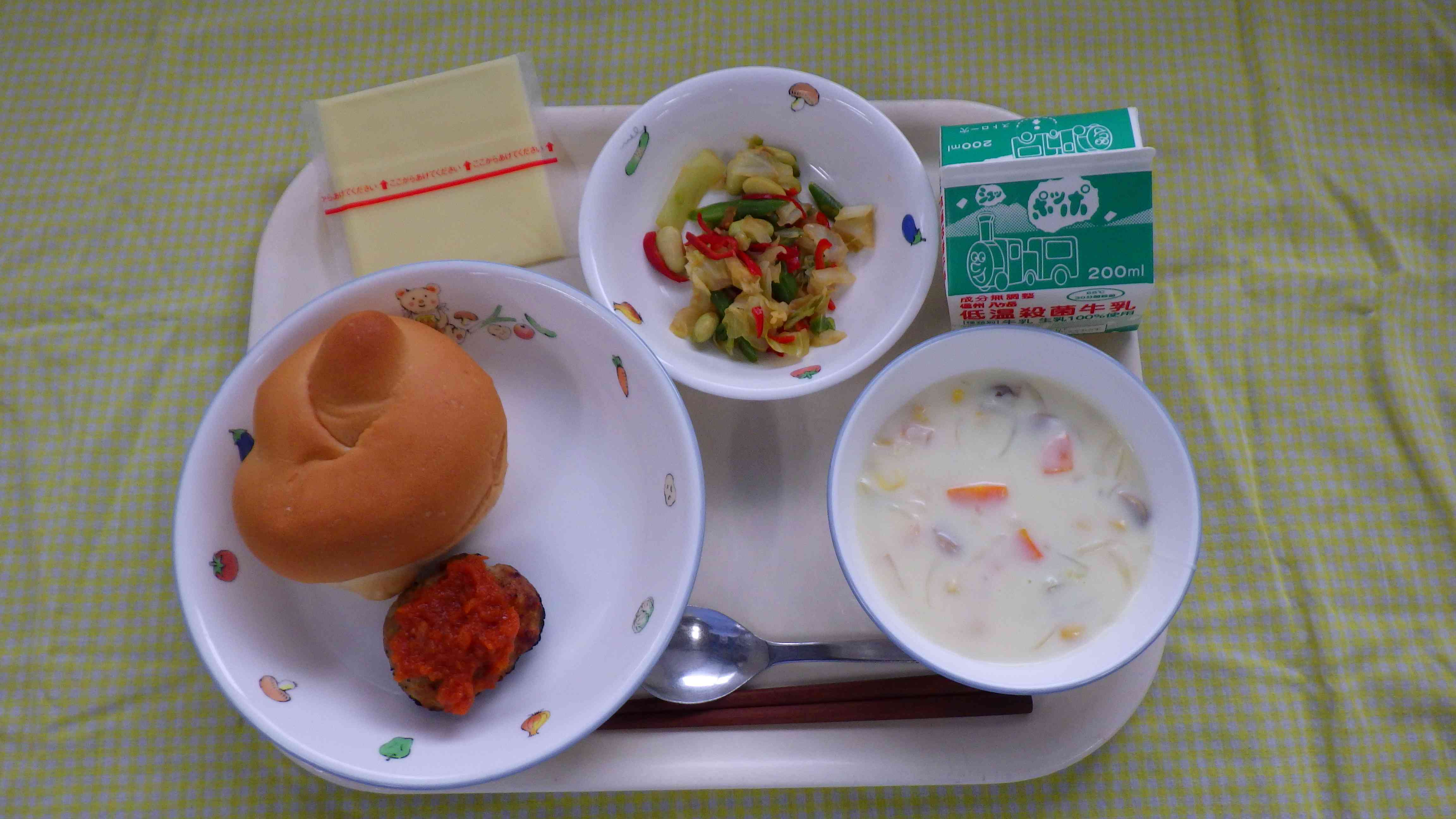 ★世界の料理 アメリカ★ チーズバーガー(セルフサンド)チャウダー 青大豆の温サラダ 牛乳
