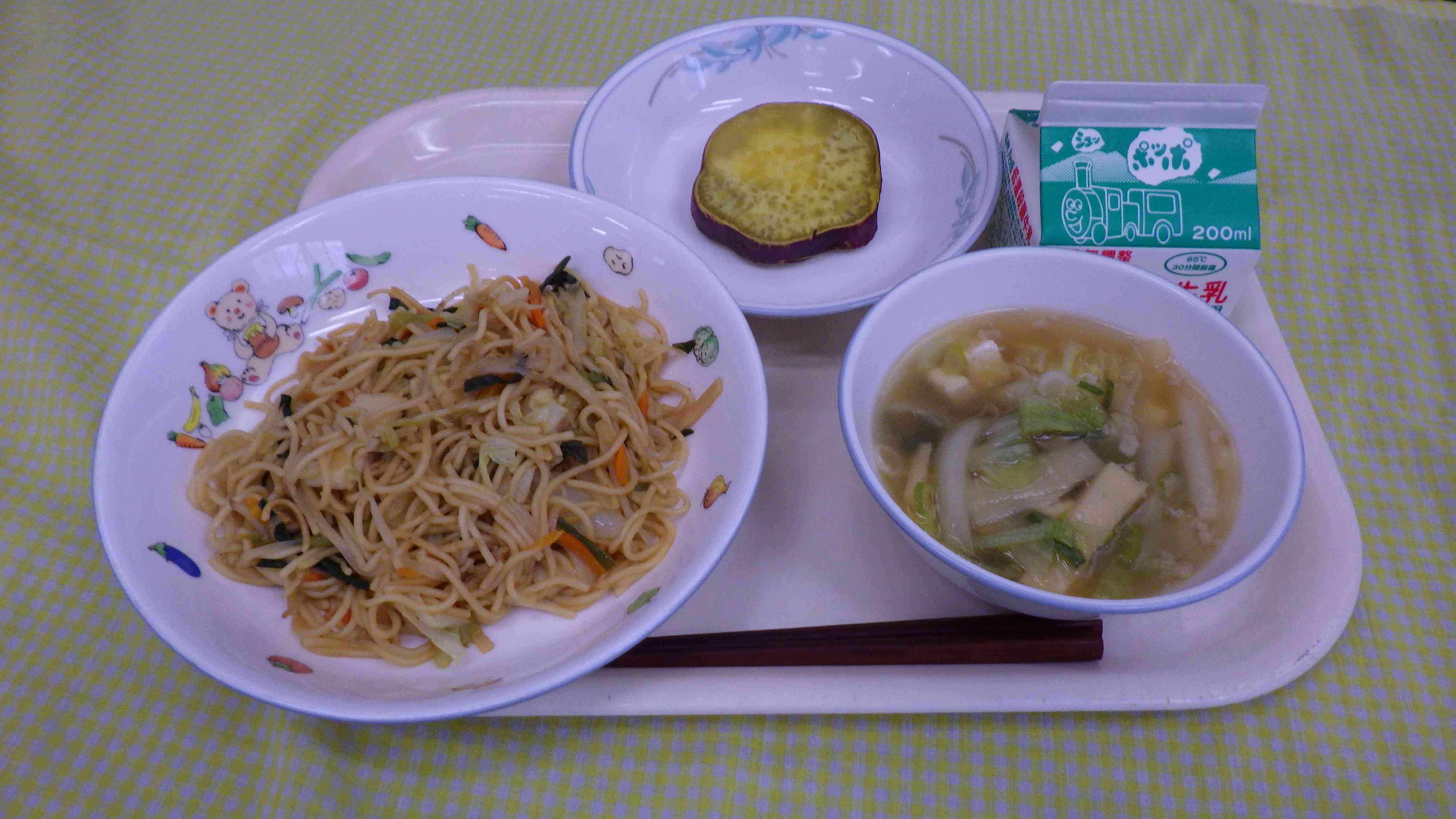 炒め焼きそば 香味スープ ふかし芋 牛乳