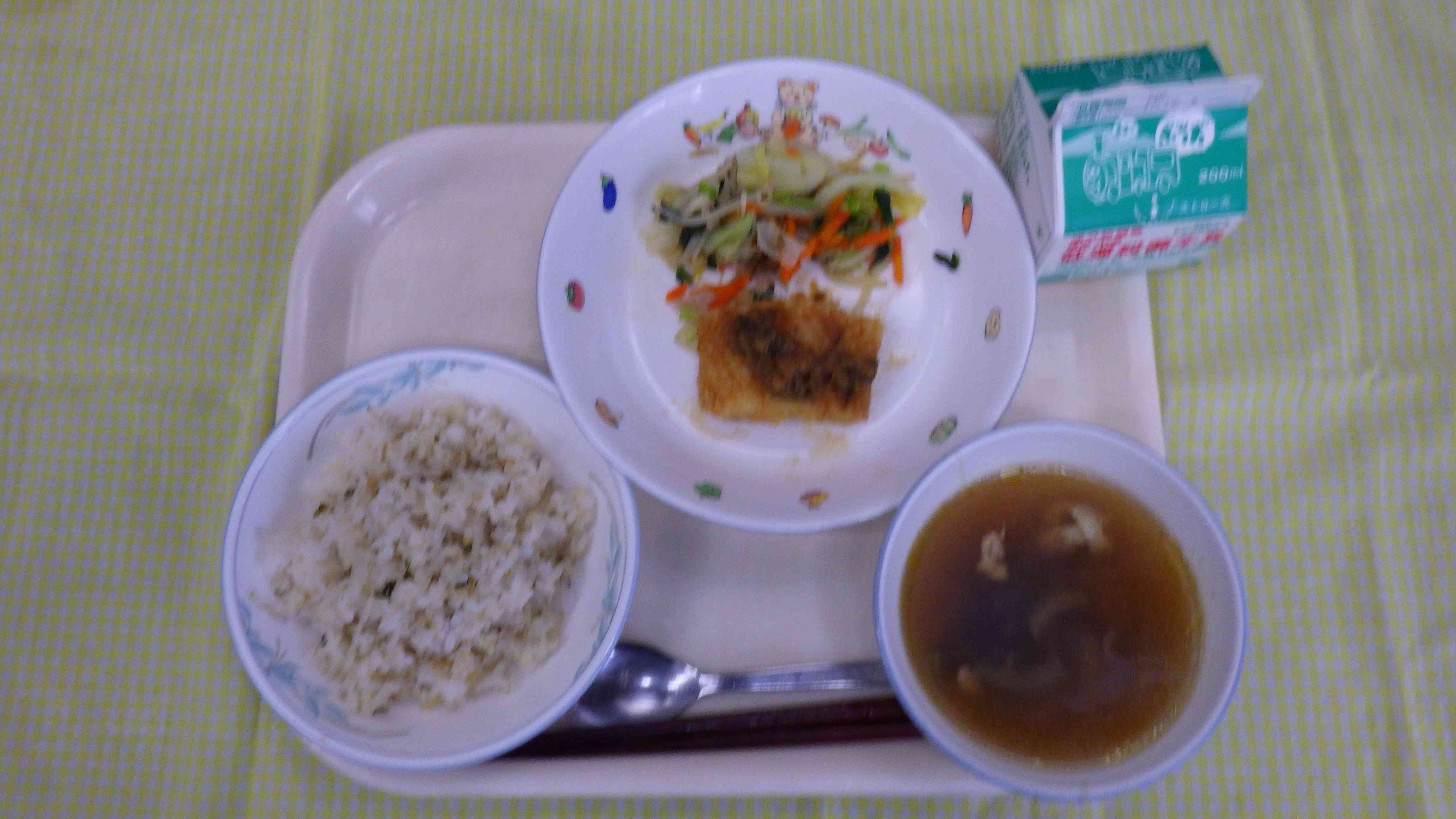 じゃこ入りガーリックチャーハン わかめスープ いかの唐揚げねぎソースかけ 野菜ソテー 牛乳