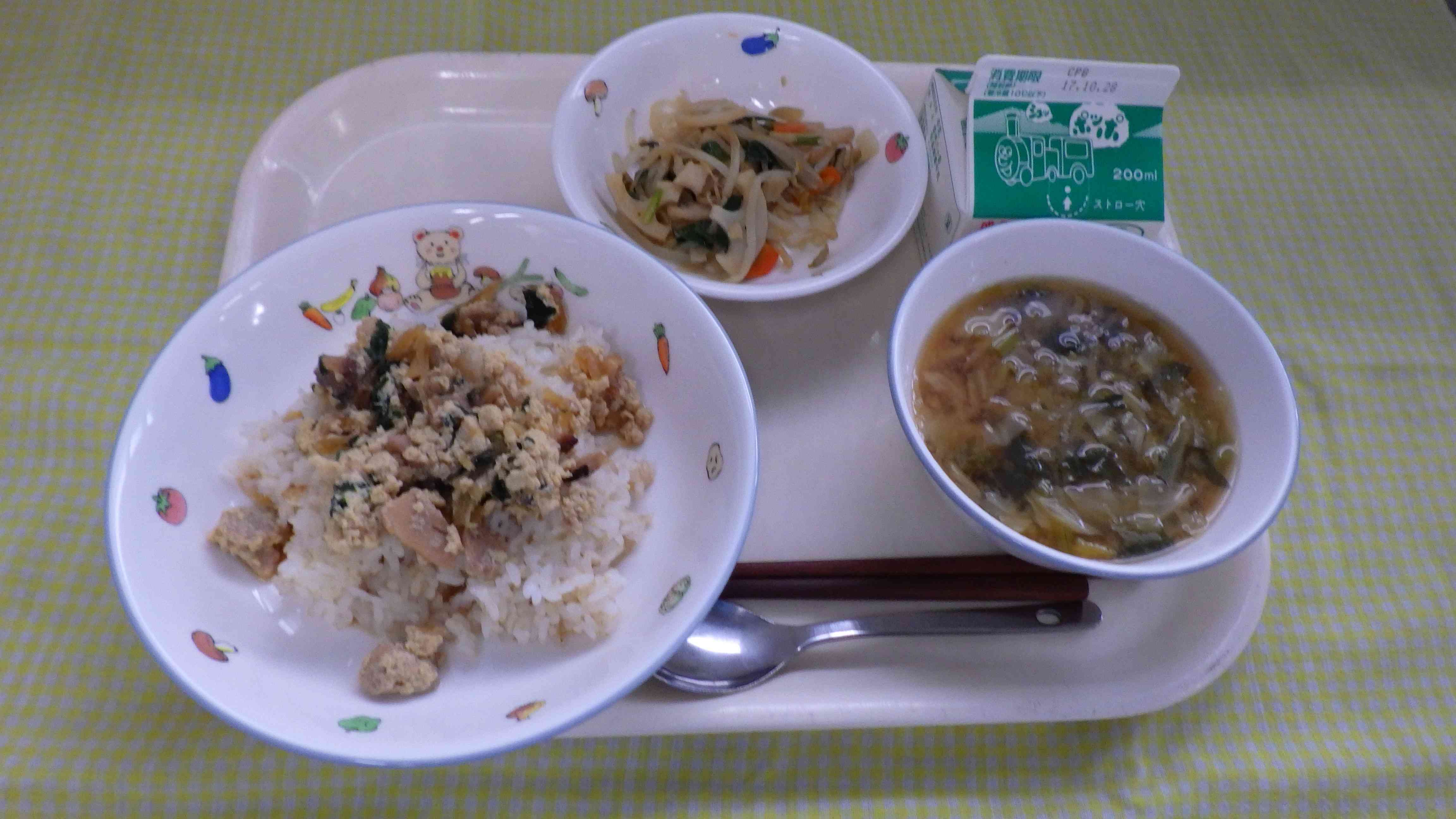 親子丼 みそ汁 れんこんの炒め物 牛乳