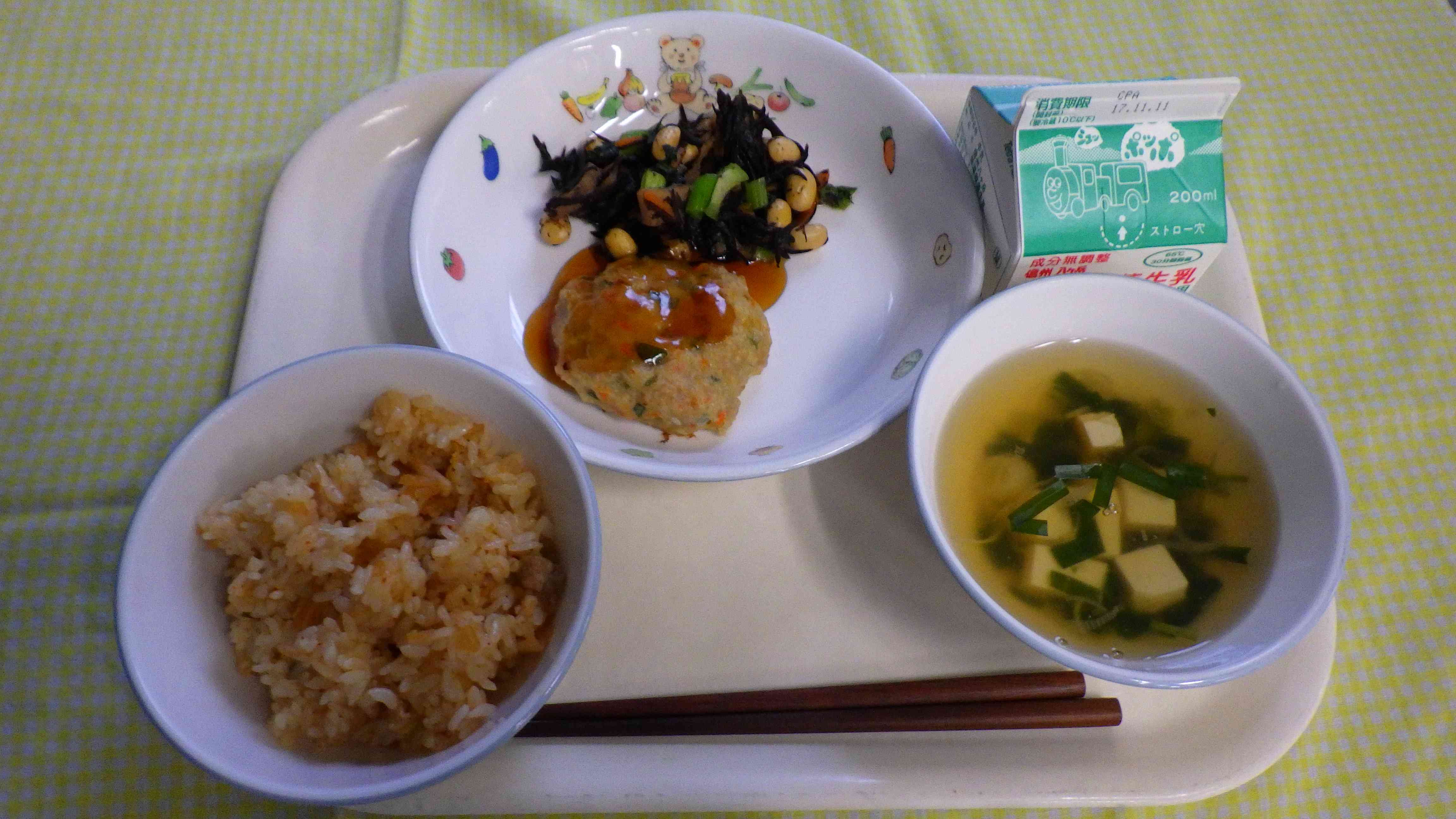 キムタクごはん すまし汁 こんこんつくね ひじきと大豆の煮物 牛乳