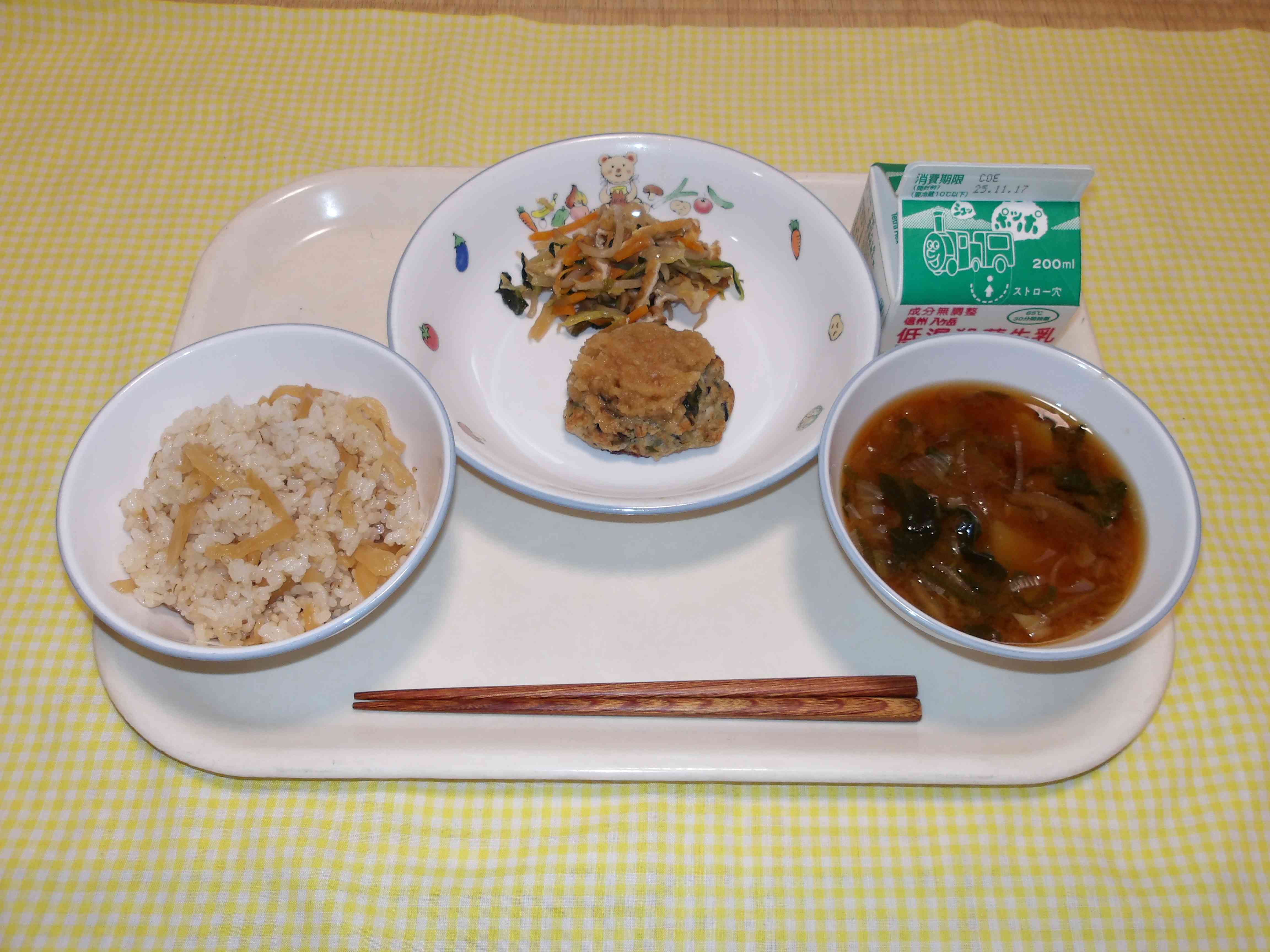 たくわんご飯 みそ汁 つくね焼きおろしソース 油揚げと野菜の炒め物