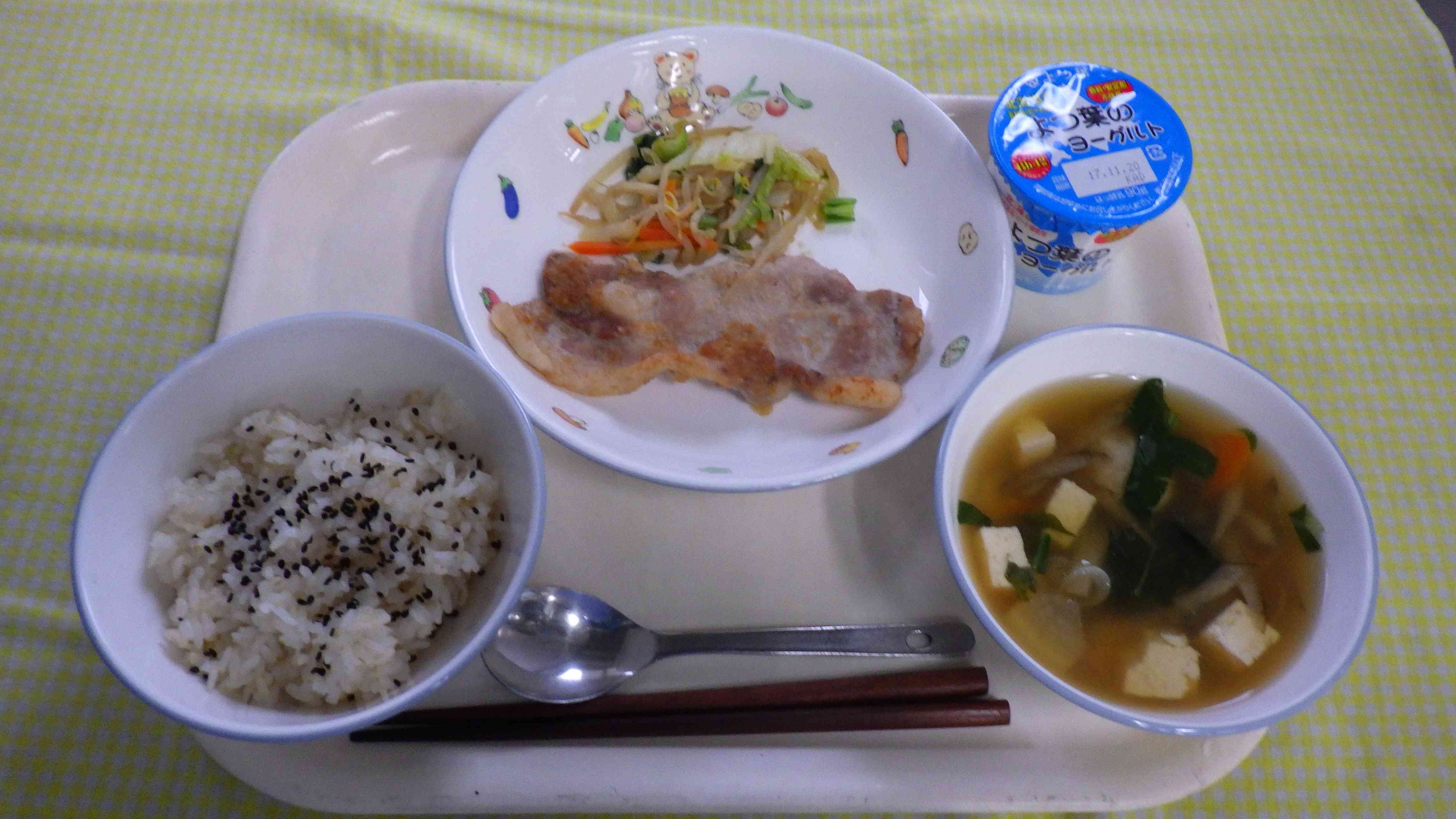 ゴマ塩ごはん いわしのつみれ汁 焼き肉 温野菜 ヨーグルト
