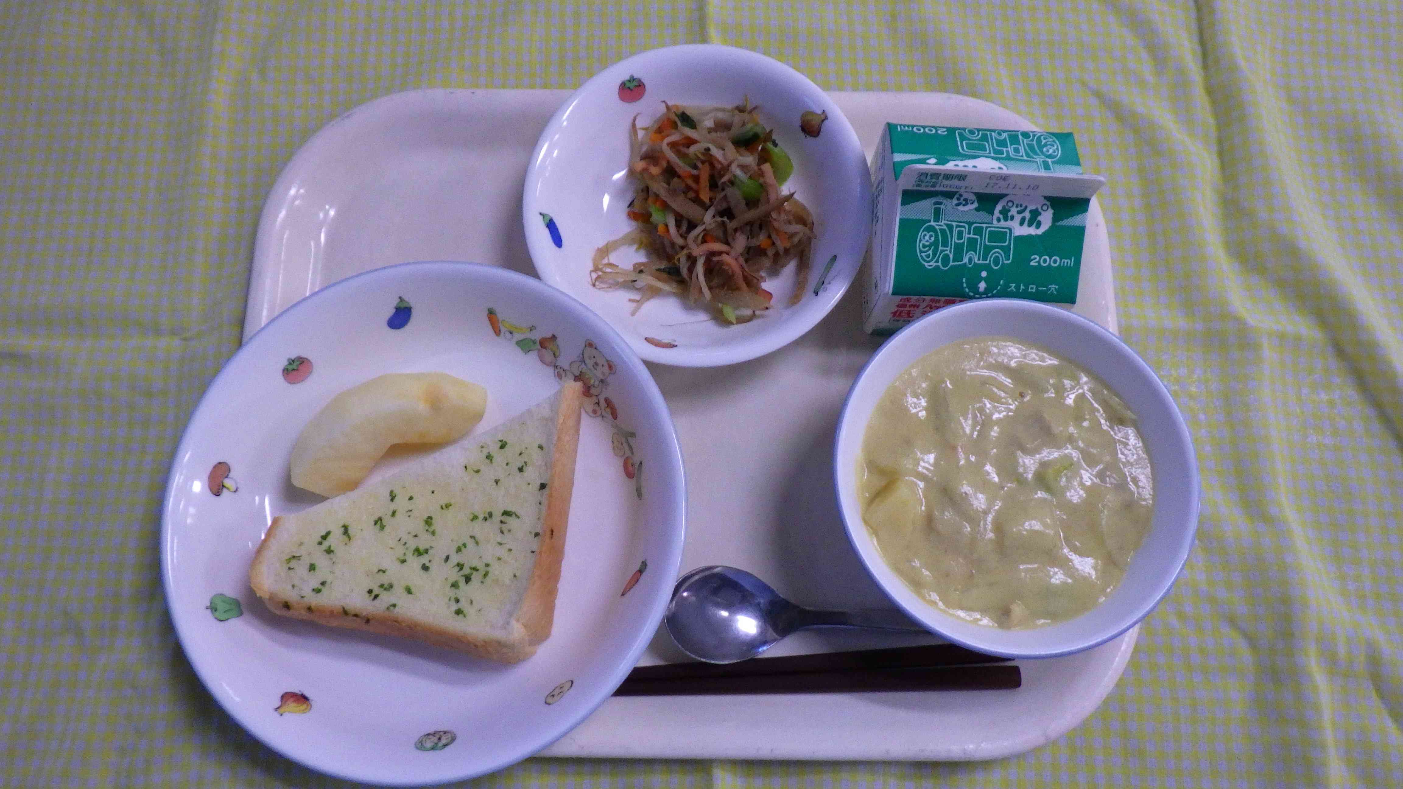 ガーリックトースト カレーシチュー かみかみ温野菜 りんご 牛乳