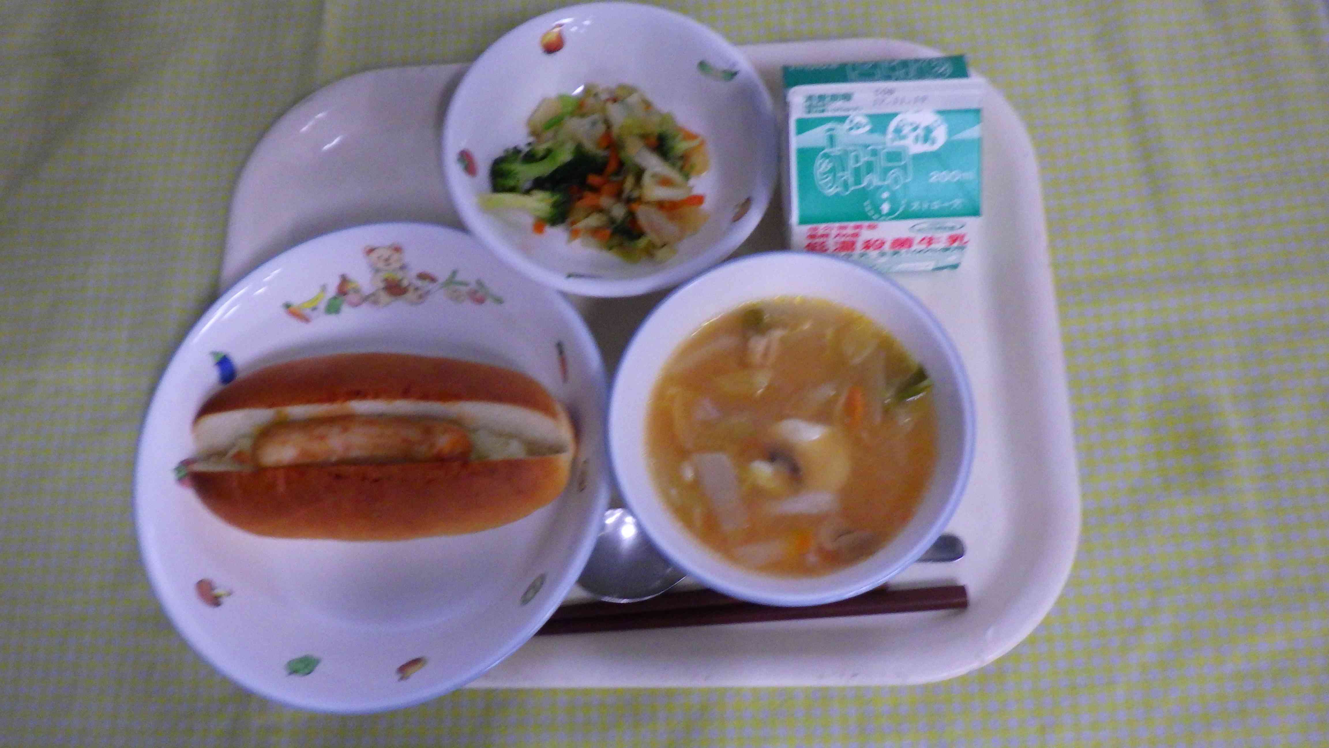 ホットドッグ ニョッキスープ 野菜ソテー 牛乳