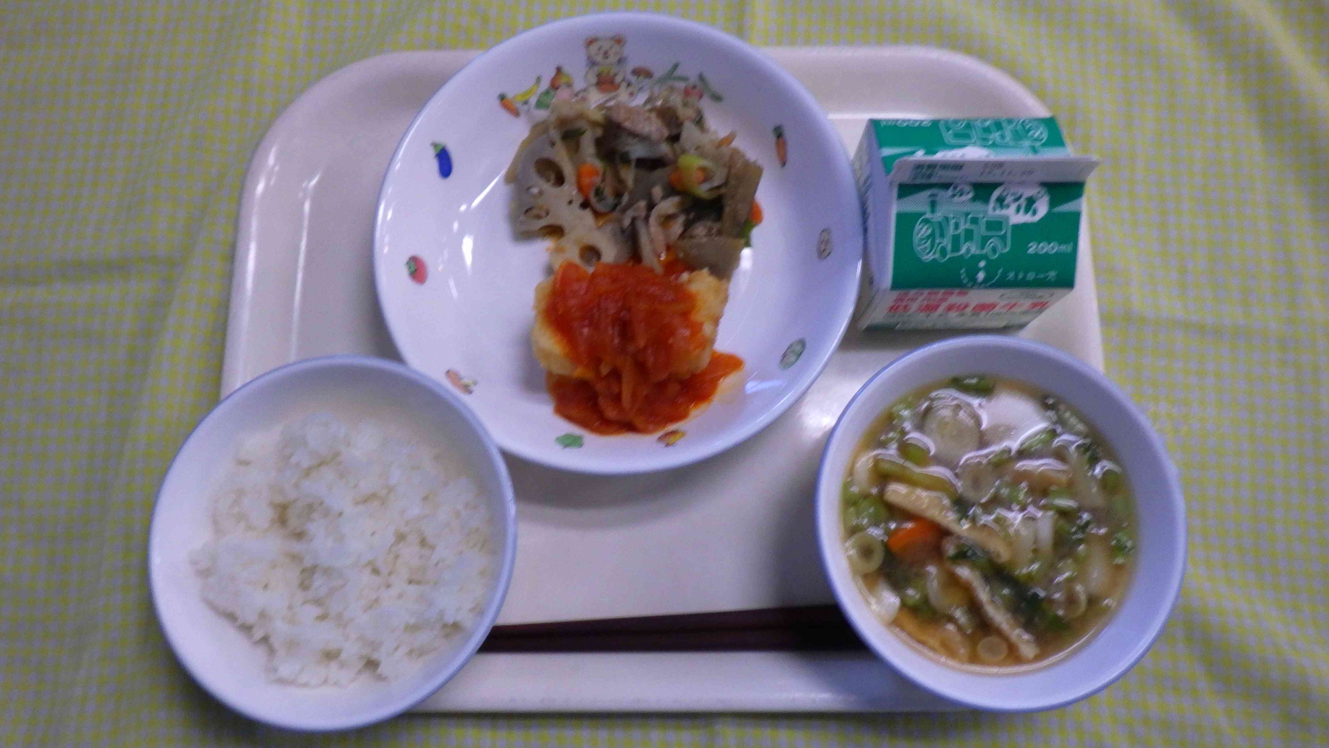 ごはん みそ汁 いかのチリソース ねぎ塩きんぴら 牛乳