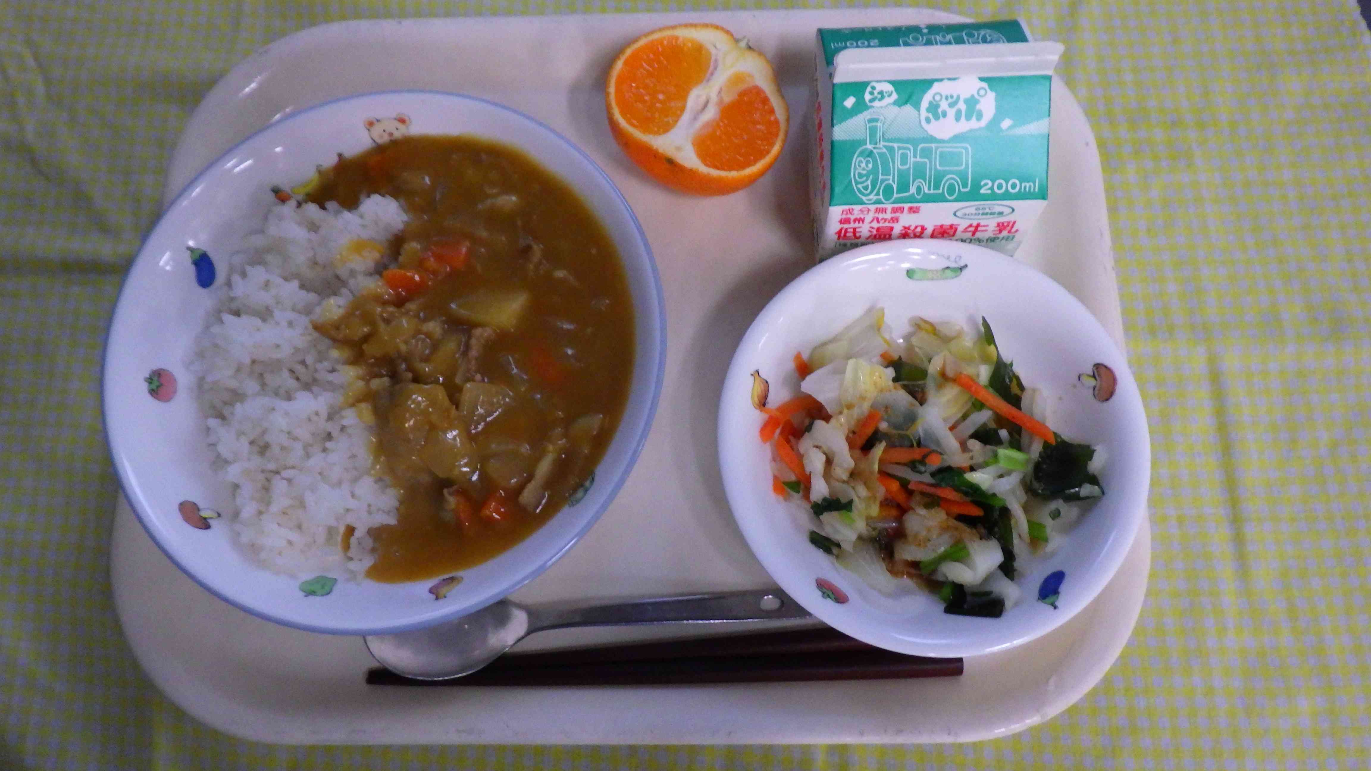 玉ねぎカレーライス ボイル野菜 韓国風ドレッシング みかん 牛乳
