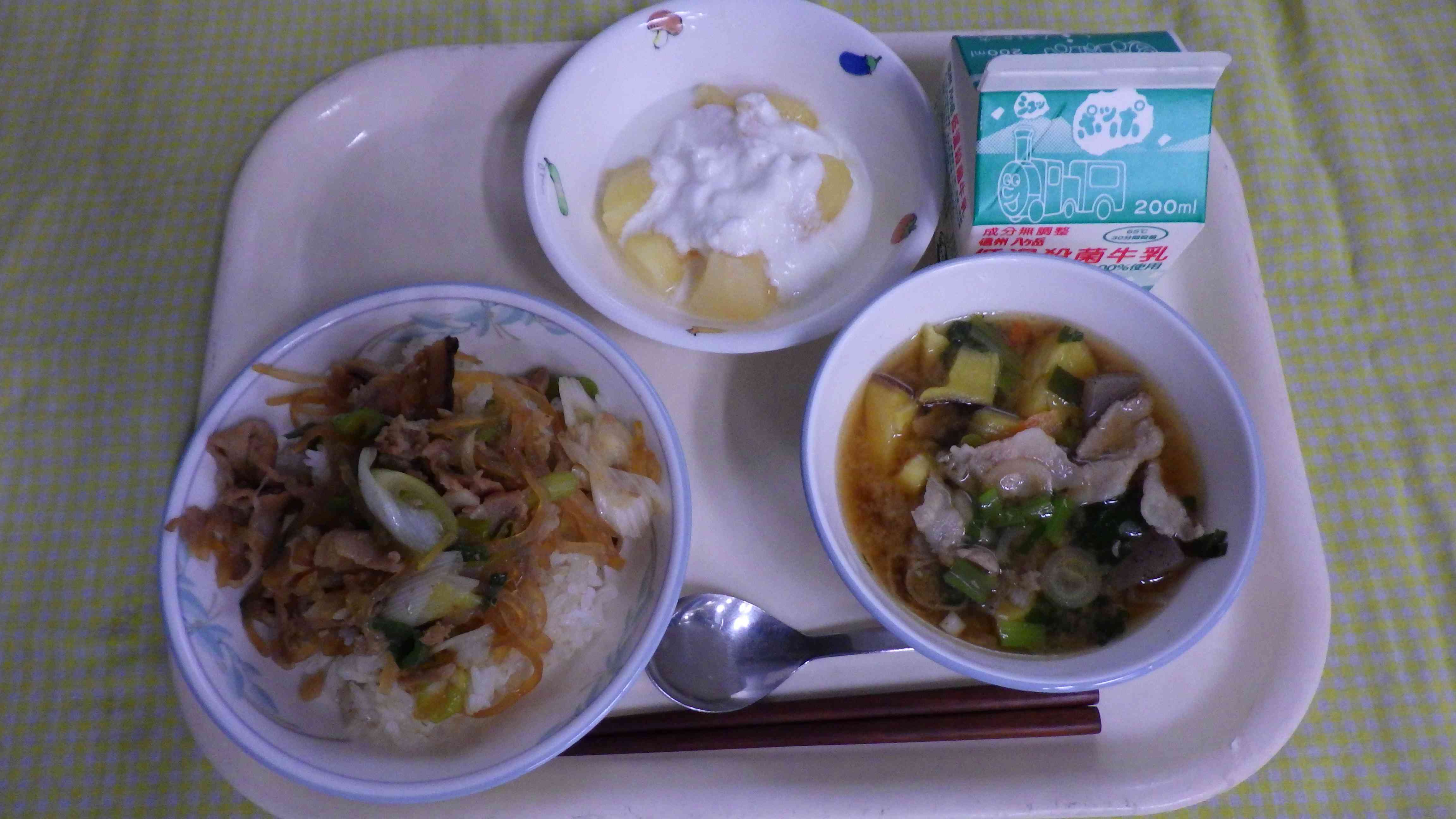 豚すき丼 さつま汁 りんごのコンポート 牛乳