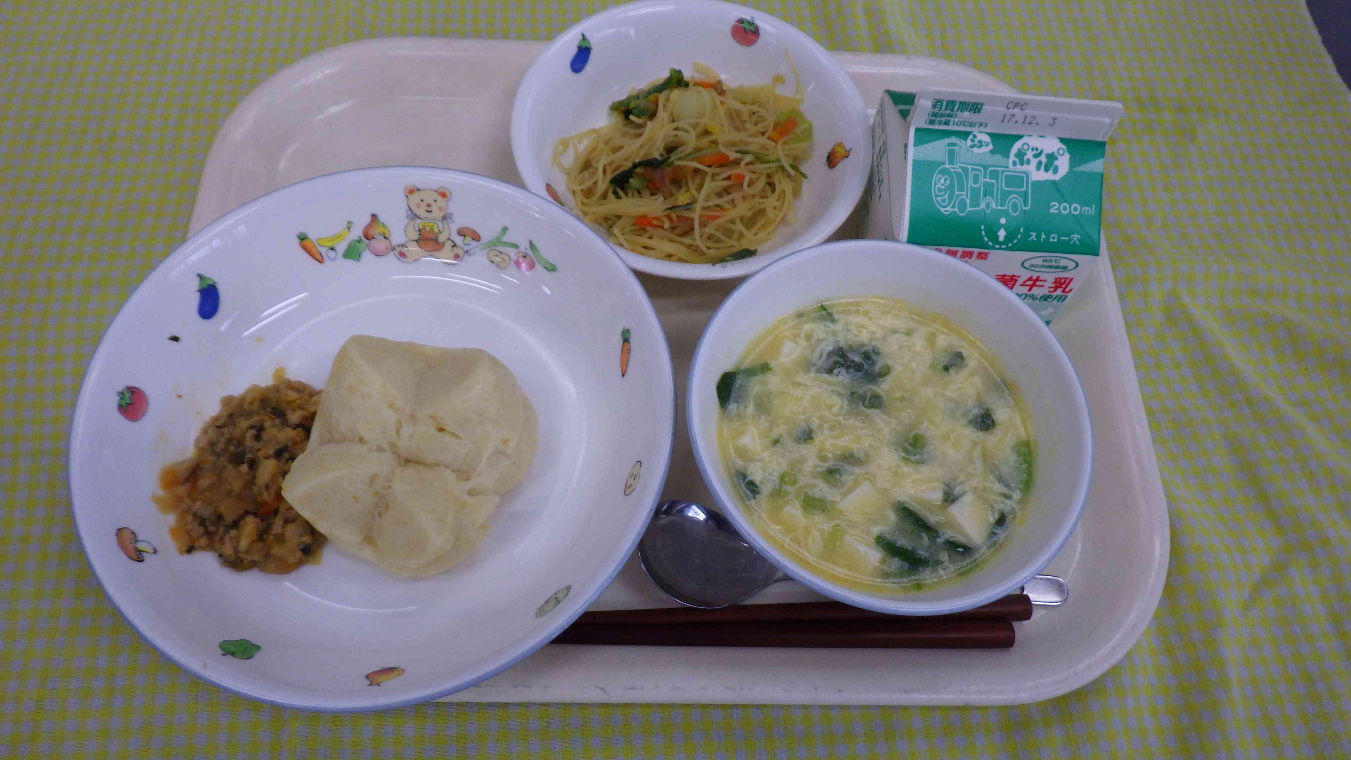 豆乳入り花巻 肉みそ 中華コーンスープ カレービーフンソテー 牛乳