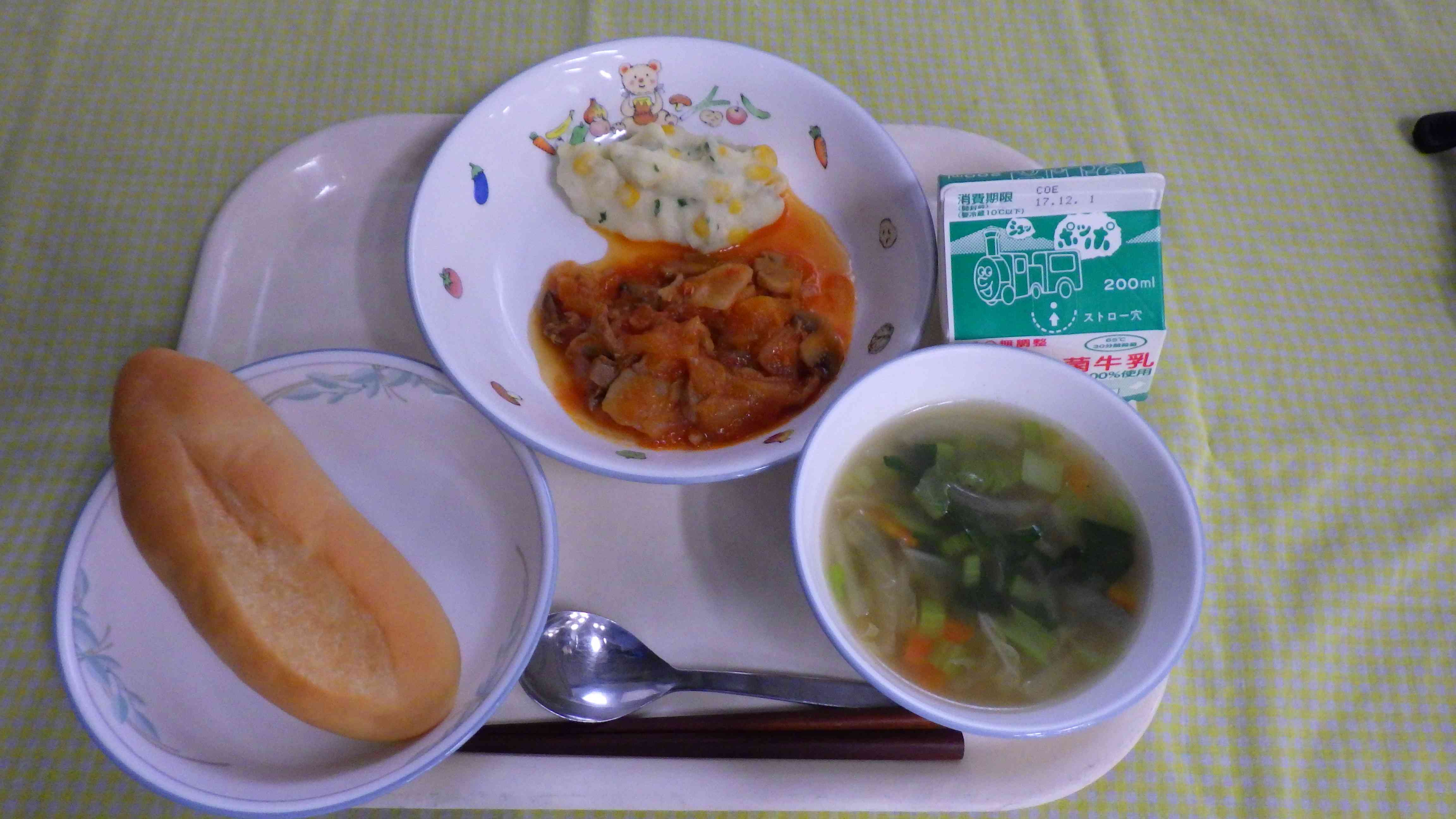 ソフトフランスパン 野菜スープ 豚肉のトマト煮込み マッシュポテト 牛乳