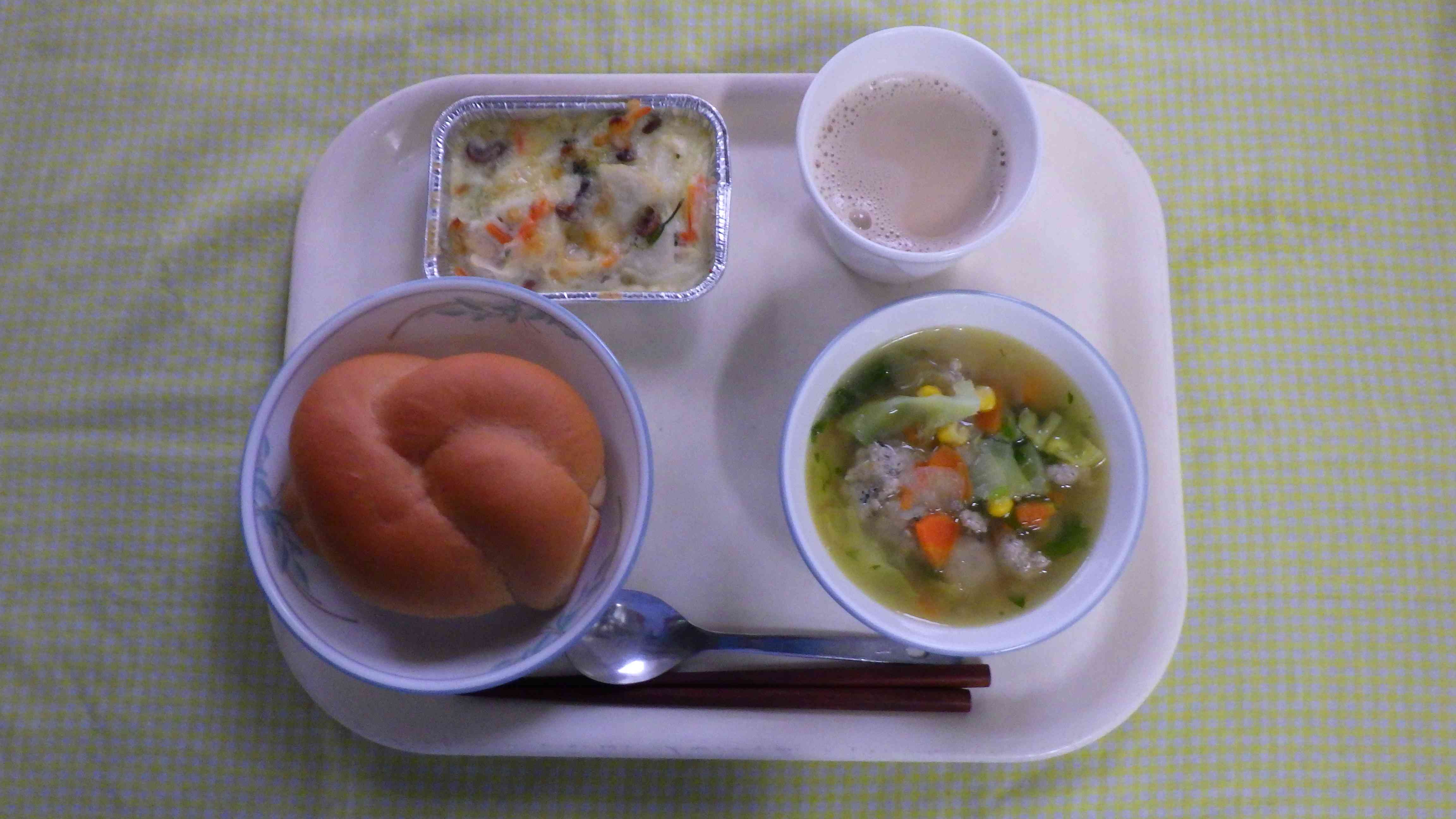 黒糖パン 肉ボールスープ 冬野菜のグラタン ミルクコーヒー
