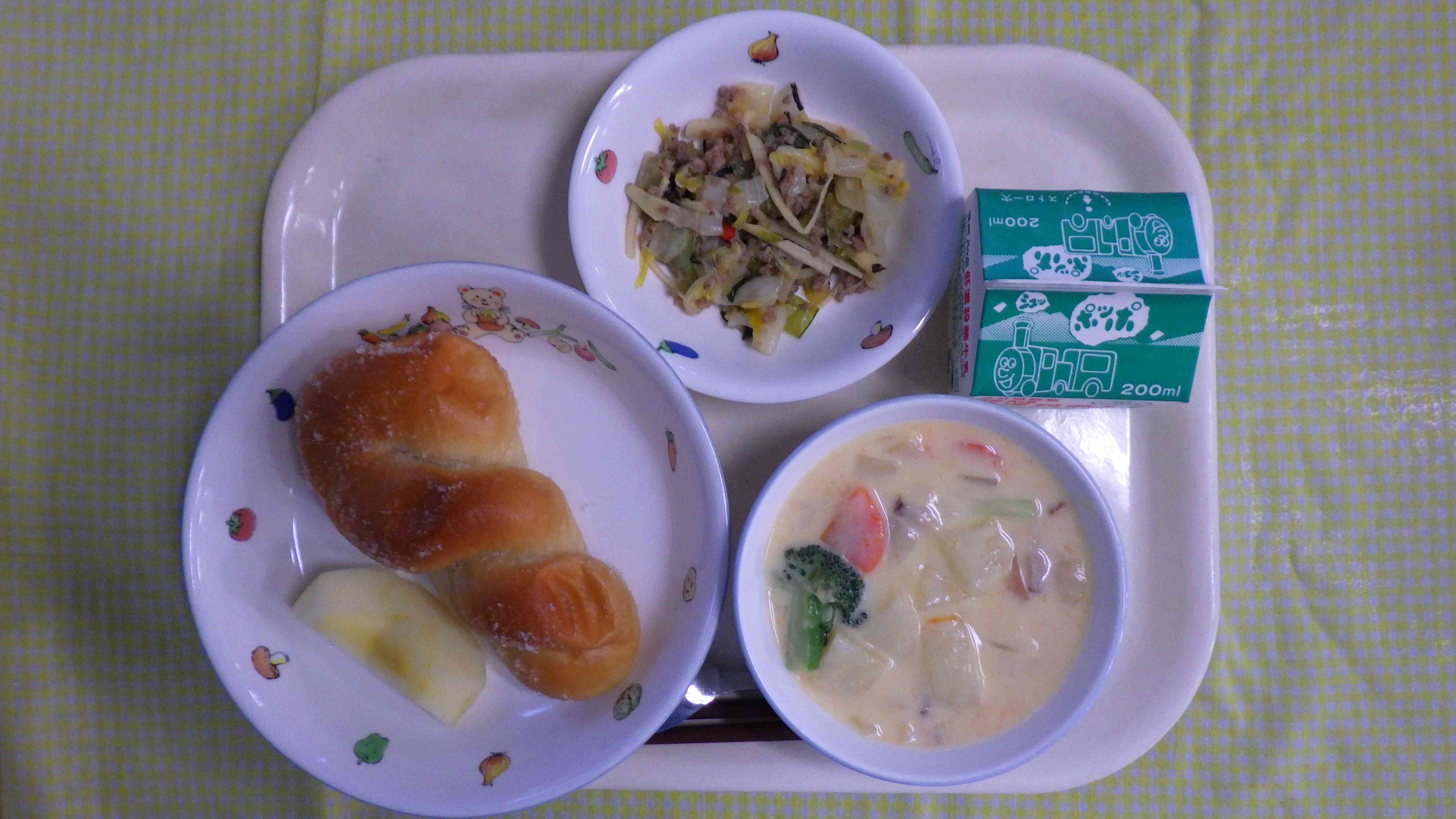 揚げパン キャロットシチュー 白菜とひき肉の炒め煮 りんご 牛乳