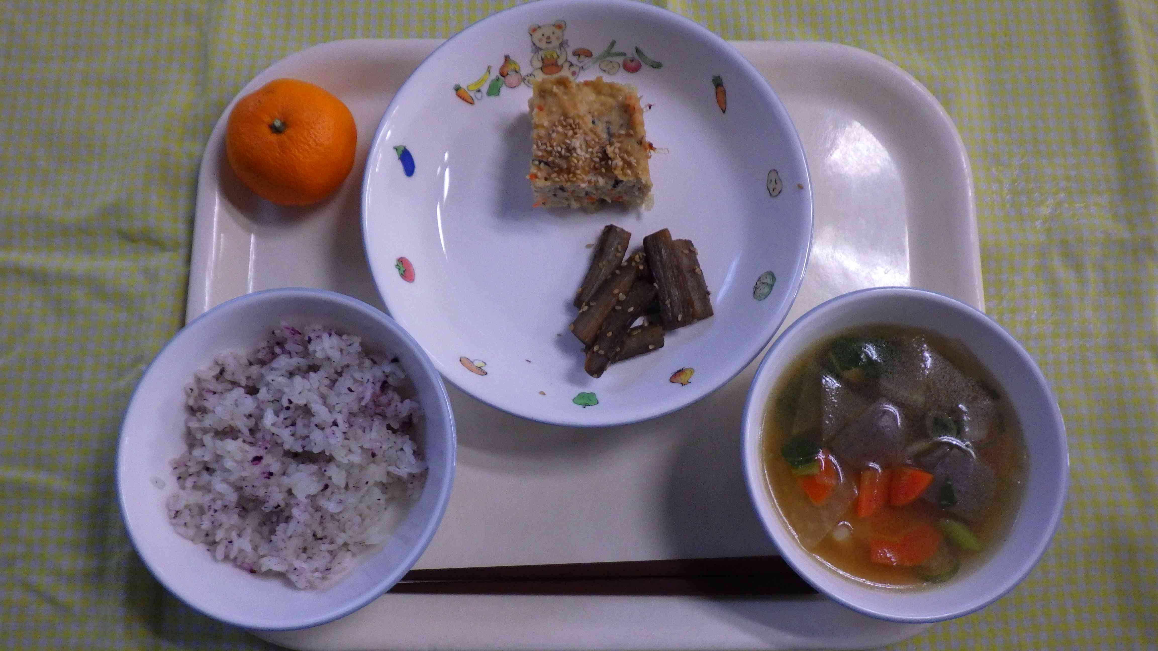 ゆかりごはん けんちん汁 松風焼き ごぼうの太煮 みかん