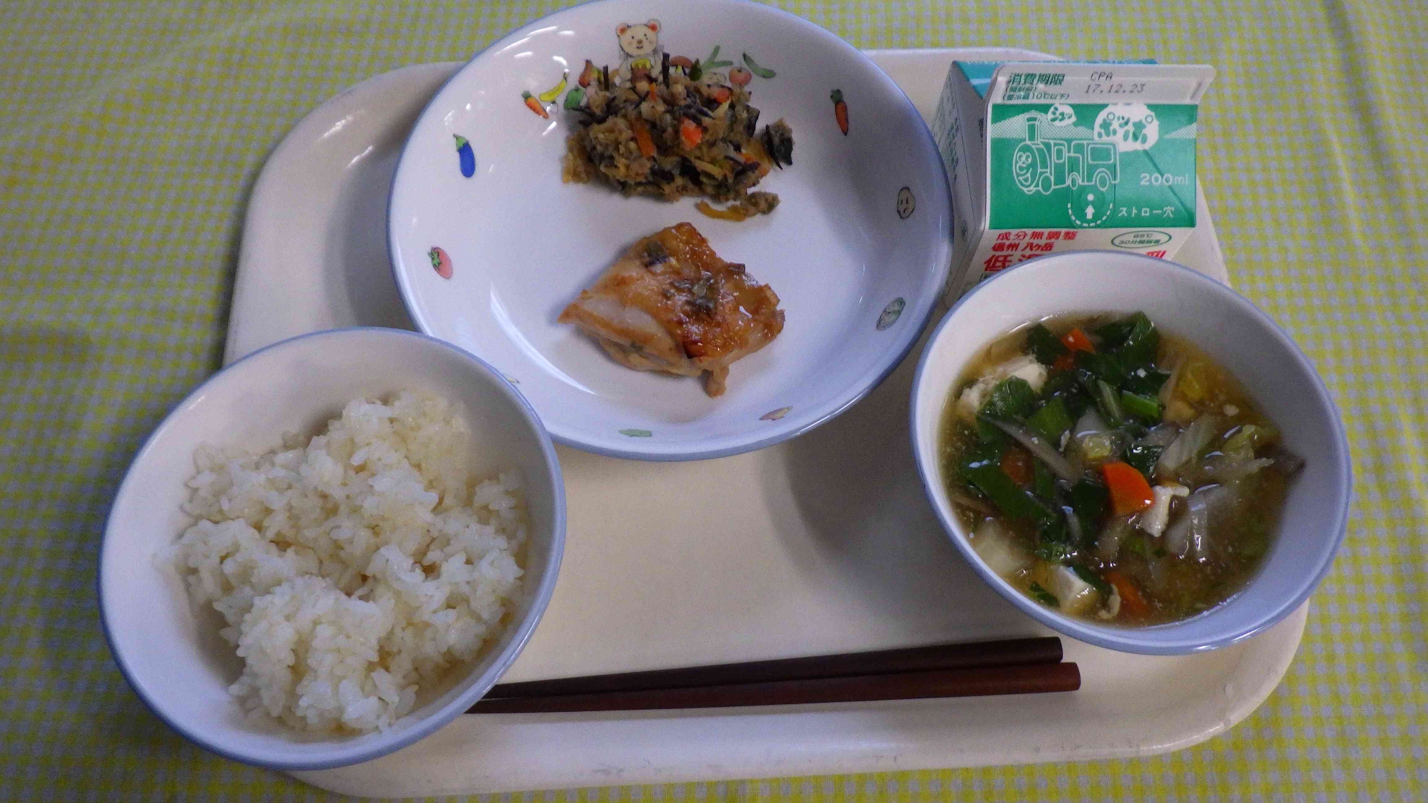 ごはん のっぺい汁 鶏の梅風味焼き 卯の花ひじき 牛乳