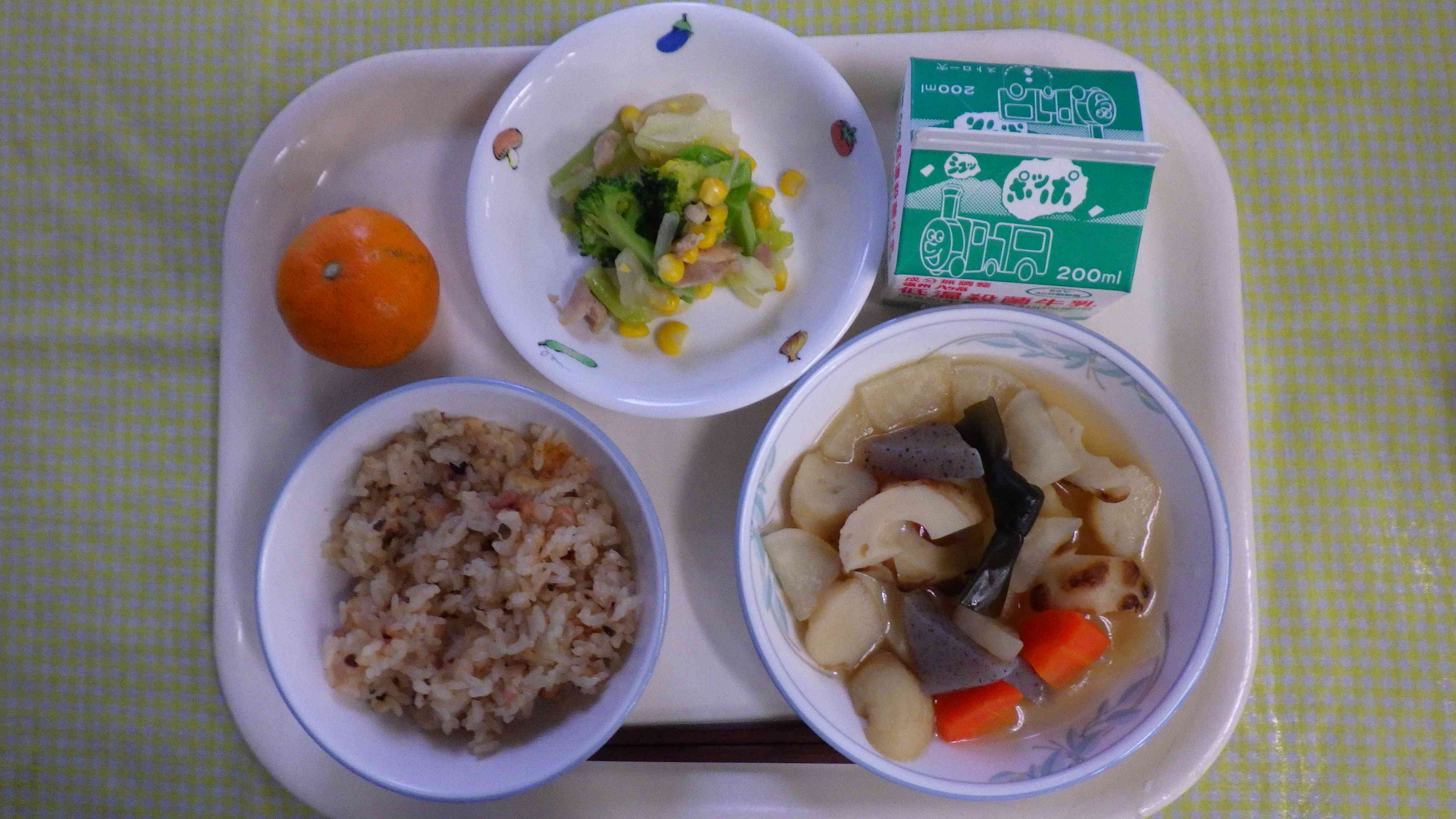 たこめし おでん コーンと野菜のソテー みかん 牛乳