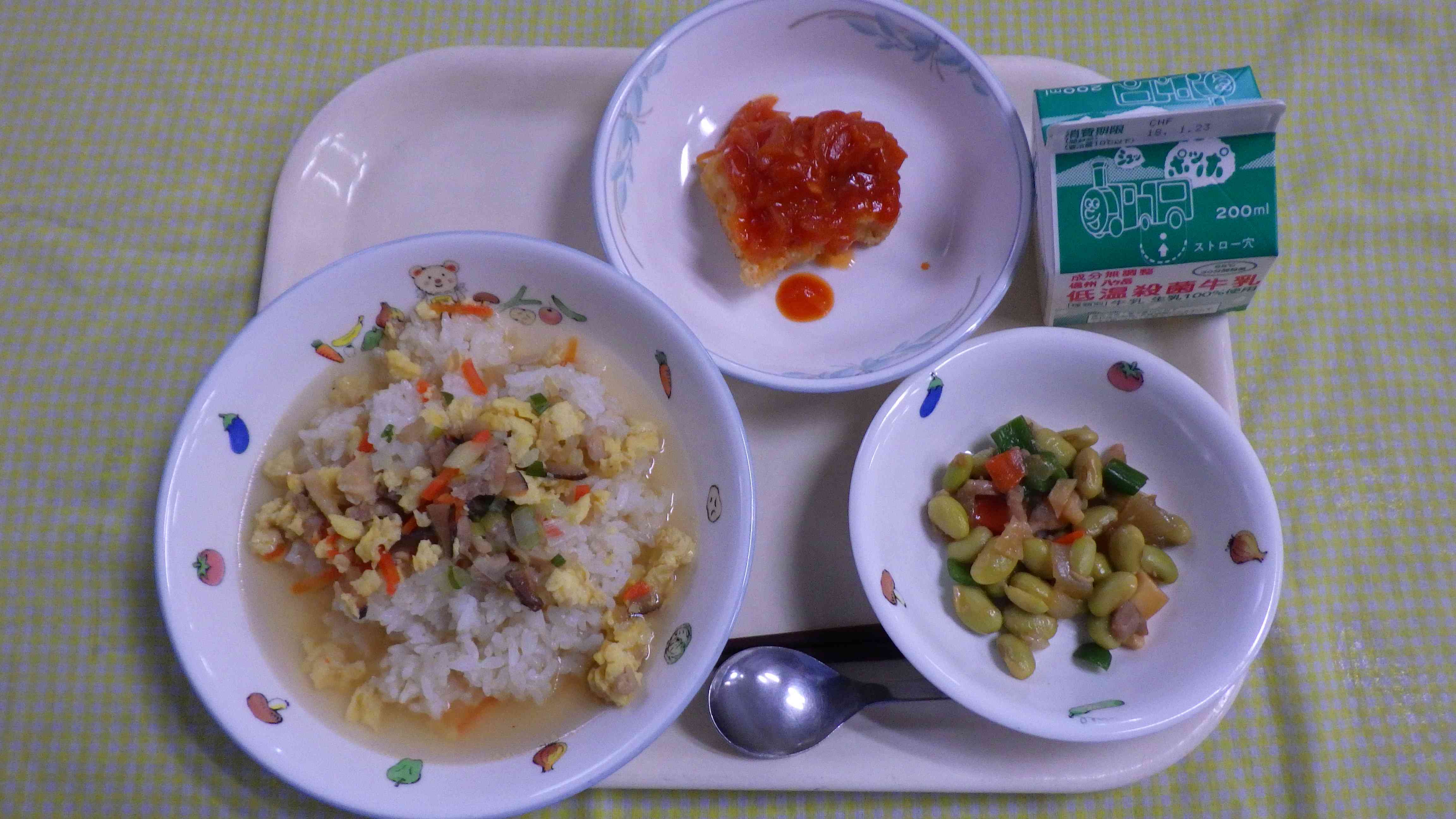 鶏飯 いかのチリソース 大豆の中華炒め 牛乳