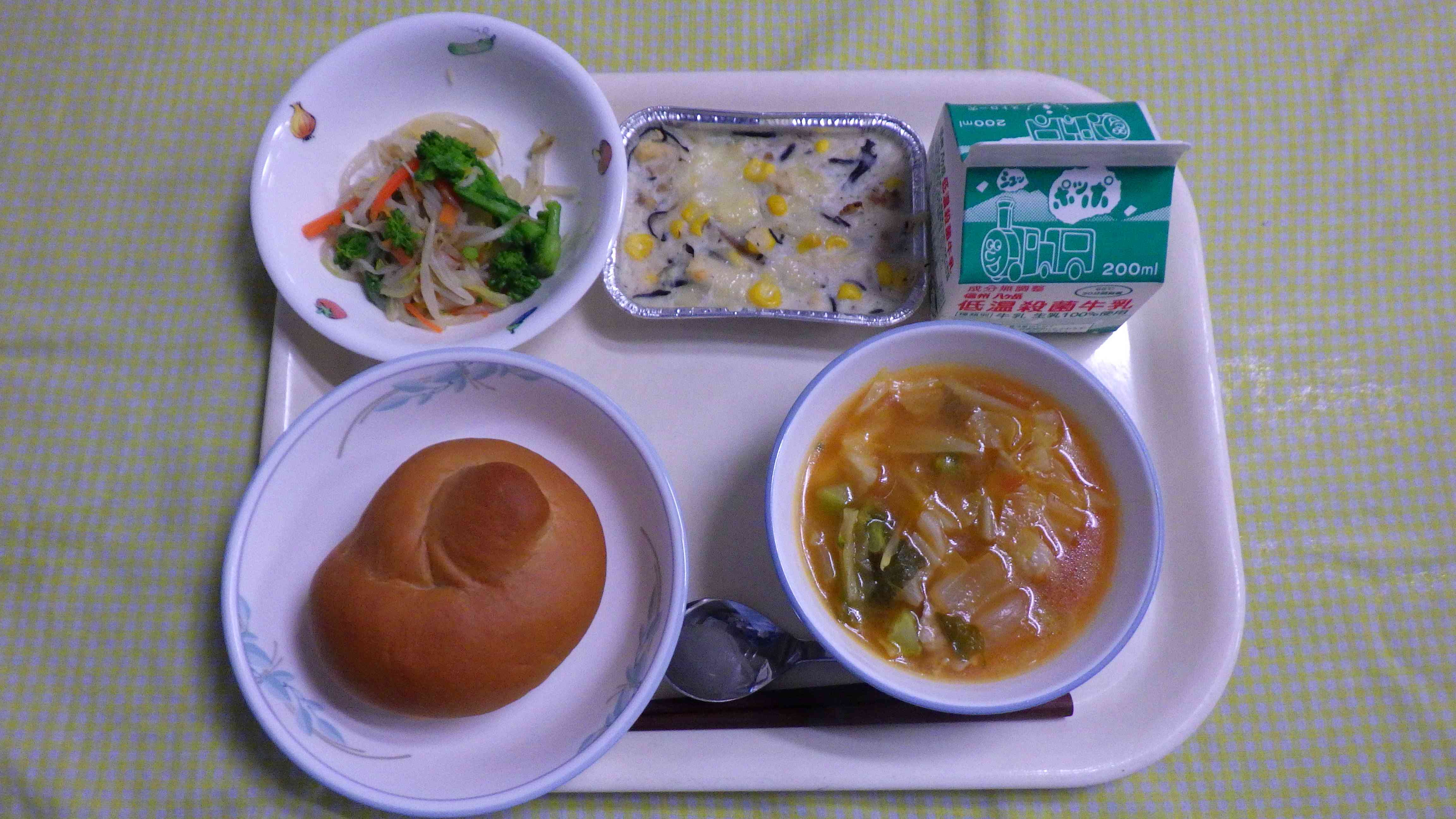 黒糖パン ABCスープ ヘルシーグラタン もやしの炒め物 牛乳