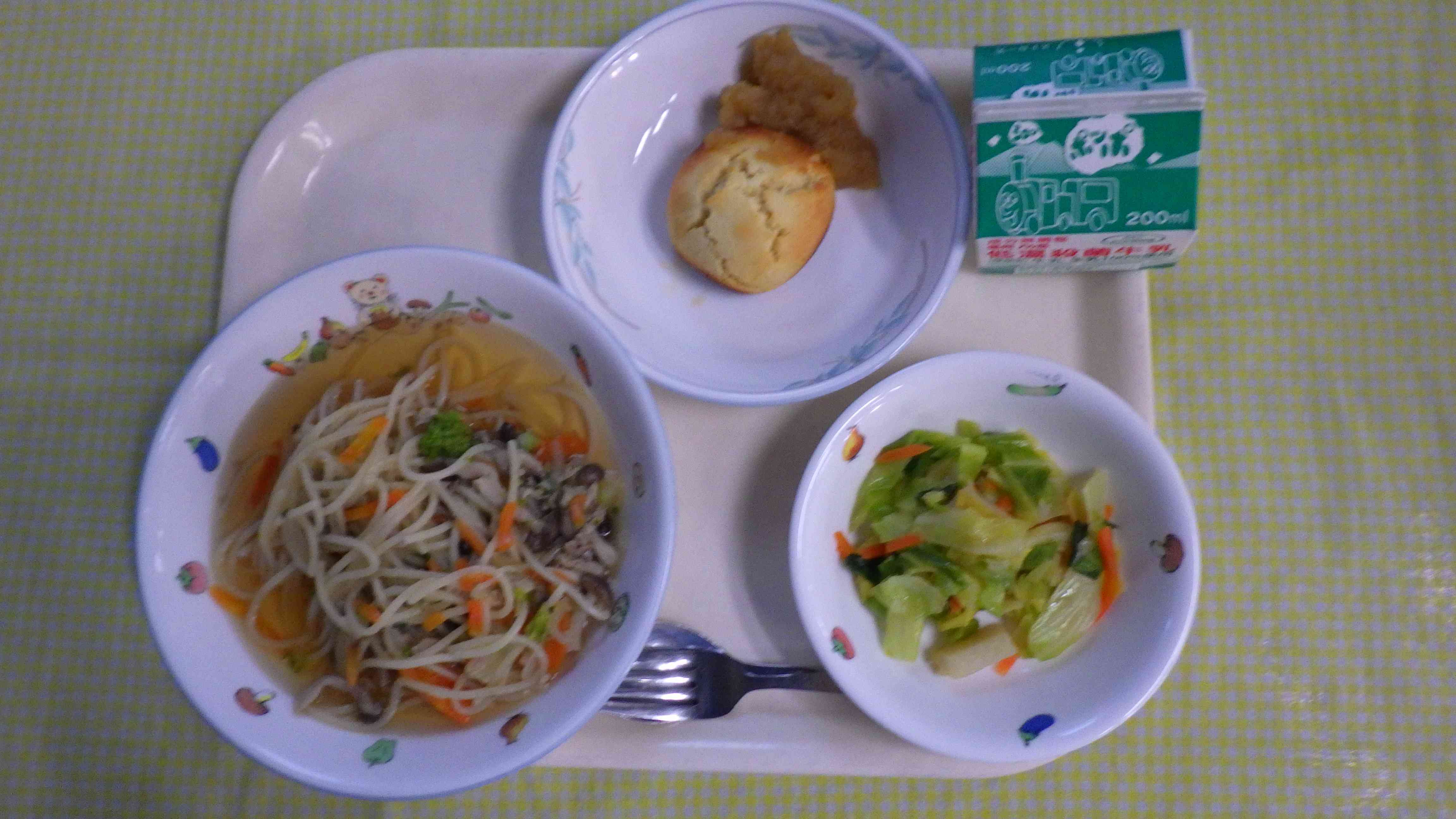 和風スープスパゲティー 野菜のピリ辛炒め 高野豆腐のスコーン 手作りりんごジャム 牛乳