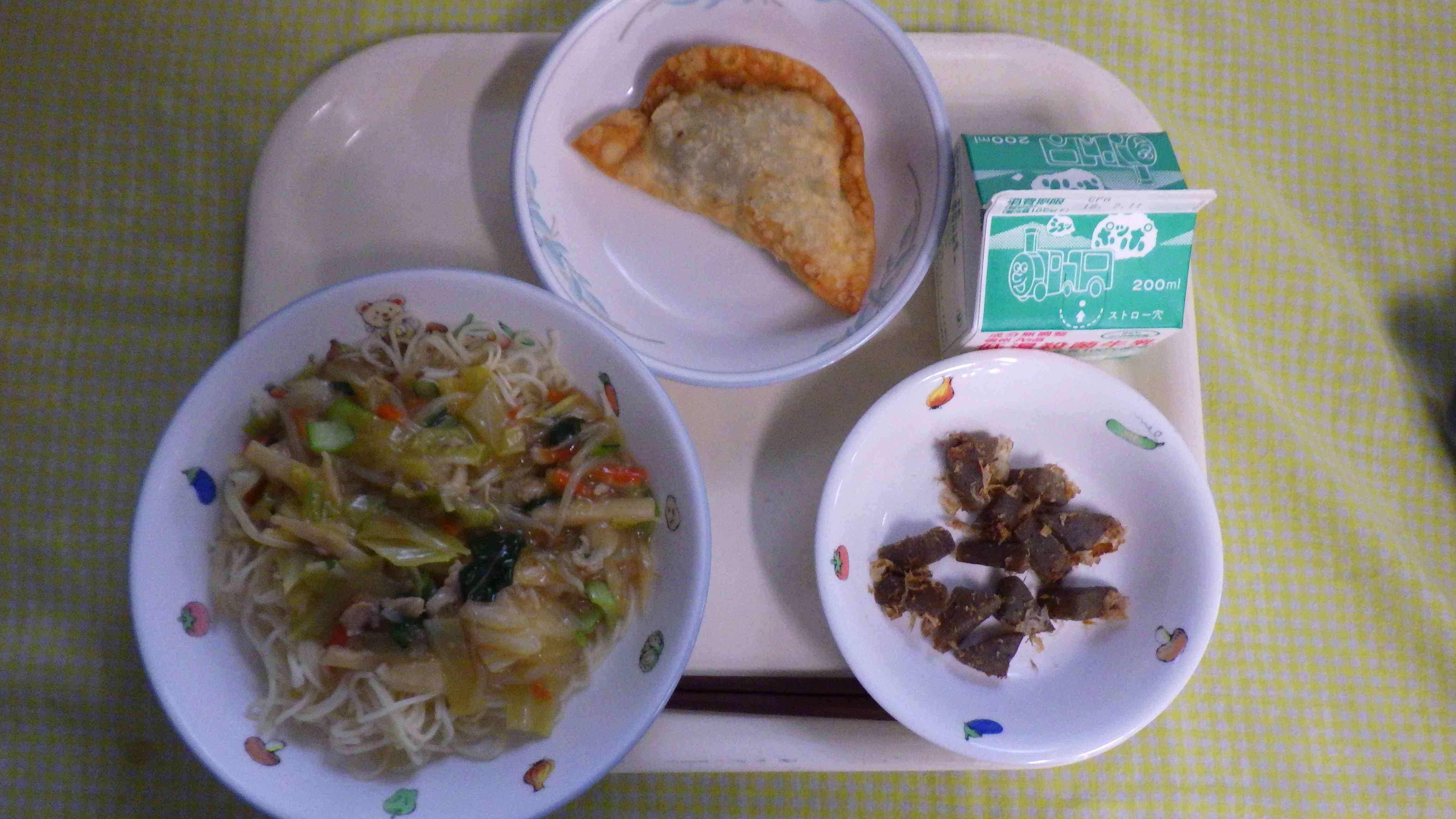 焼きそば五目あんかけ ジャンボ餃子 こんにゃくのおかか炒め 牛乳