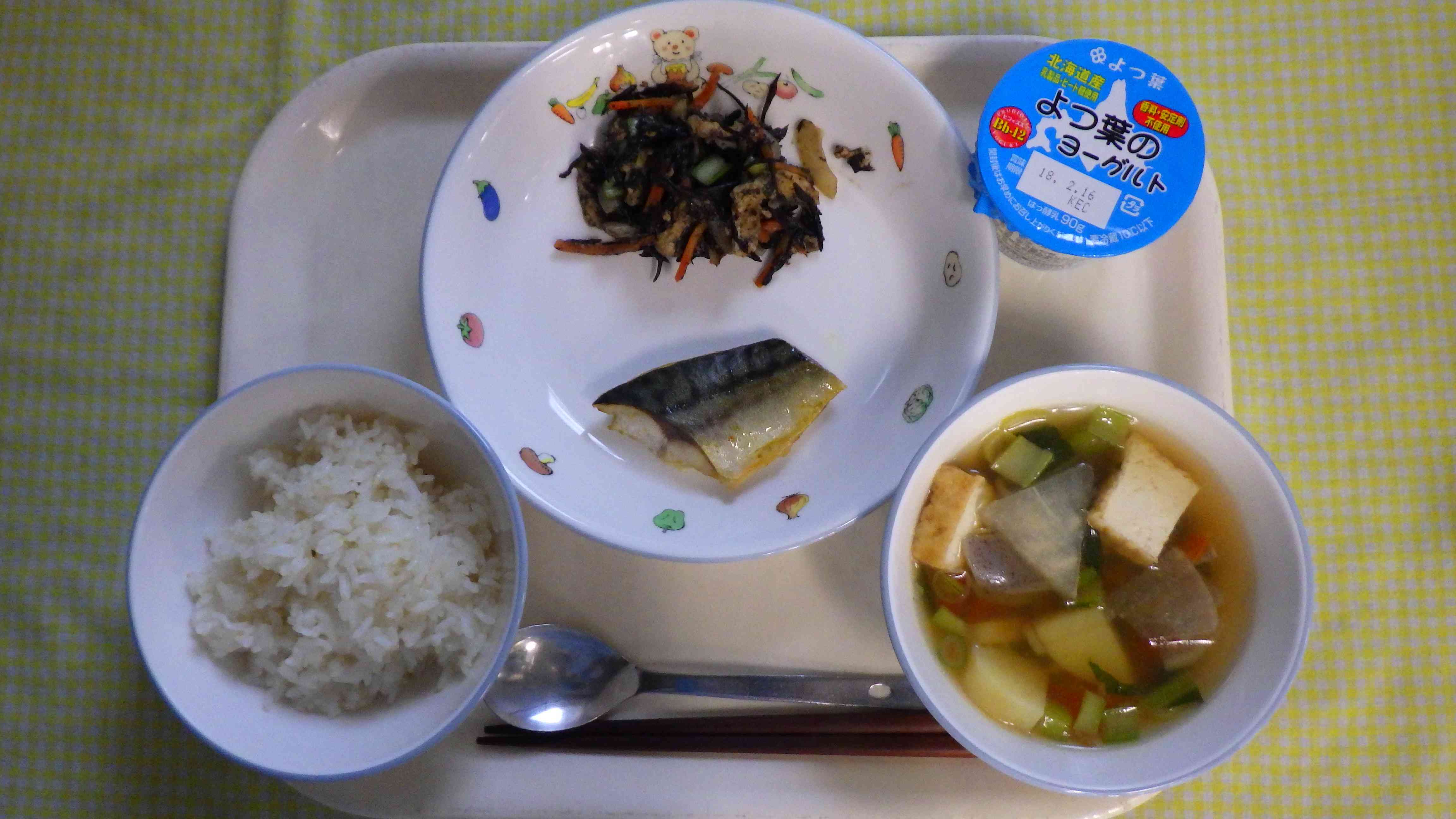 ごはん 実だくさん汁 さばのカレー焼き ひじきの炒め物 ヨーグルト