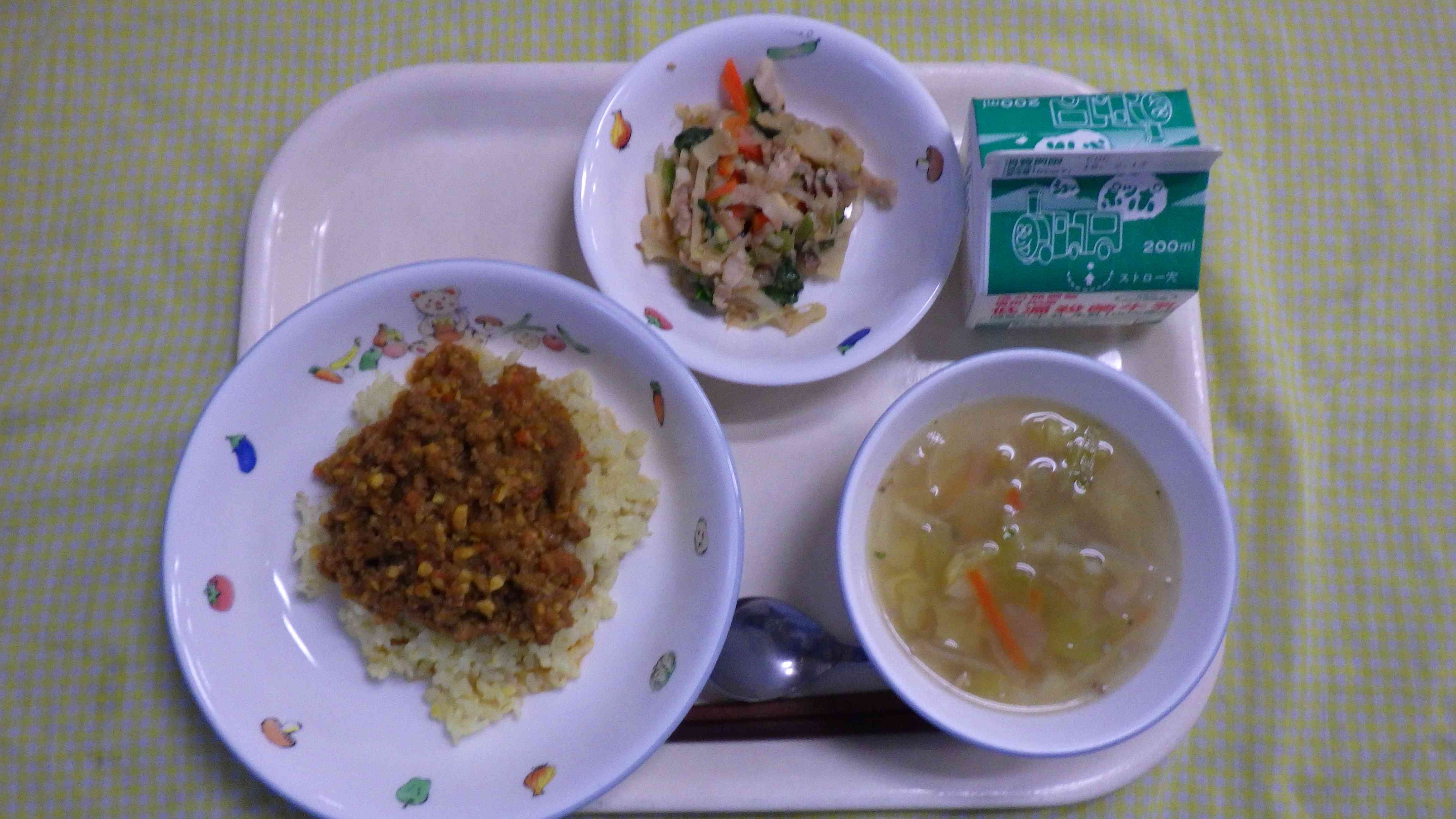 ドライカレーライス コンソメスープ かんぴょうの香り炒め 牛乳