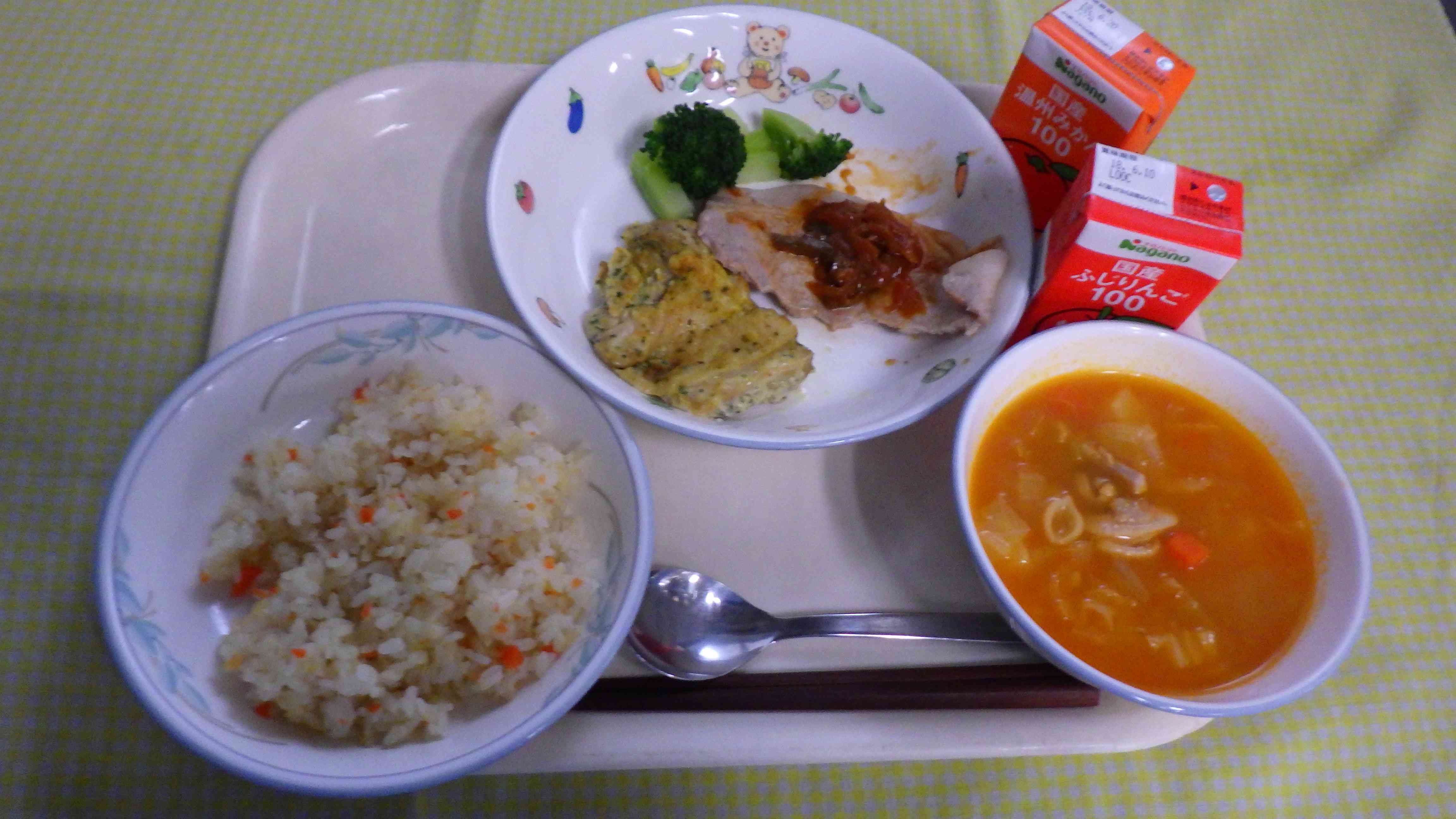 ★リザーブ給食★ 人参ピラフ ミネストローネスープ ブロッコリーの塩ゆで タンドリーチキン又は豚肉のバーベキューソース りんごジュース又はオレンジジュース