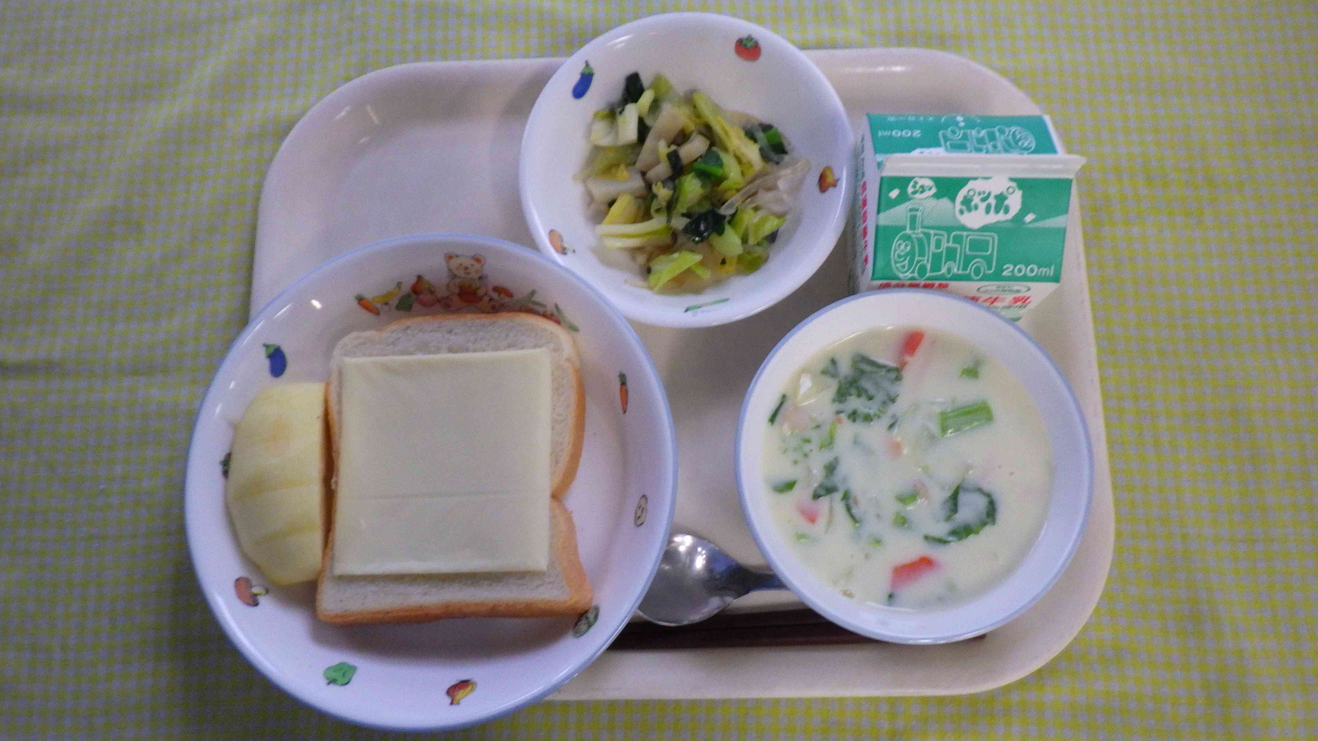 食パン スライスチーズ 菜の花のホワイトシチュー 野菜のオイスター炒め りんご 牛乳