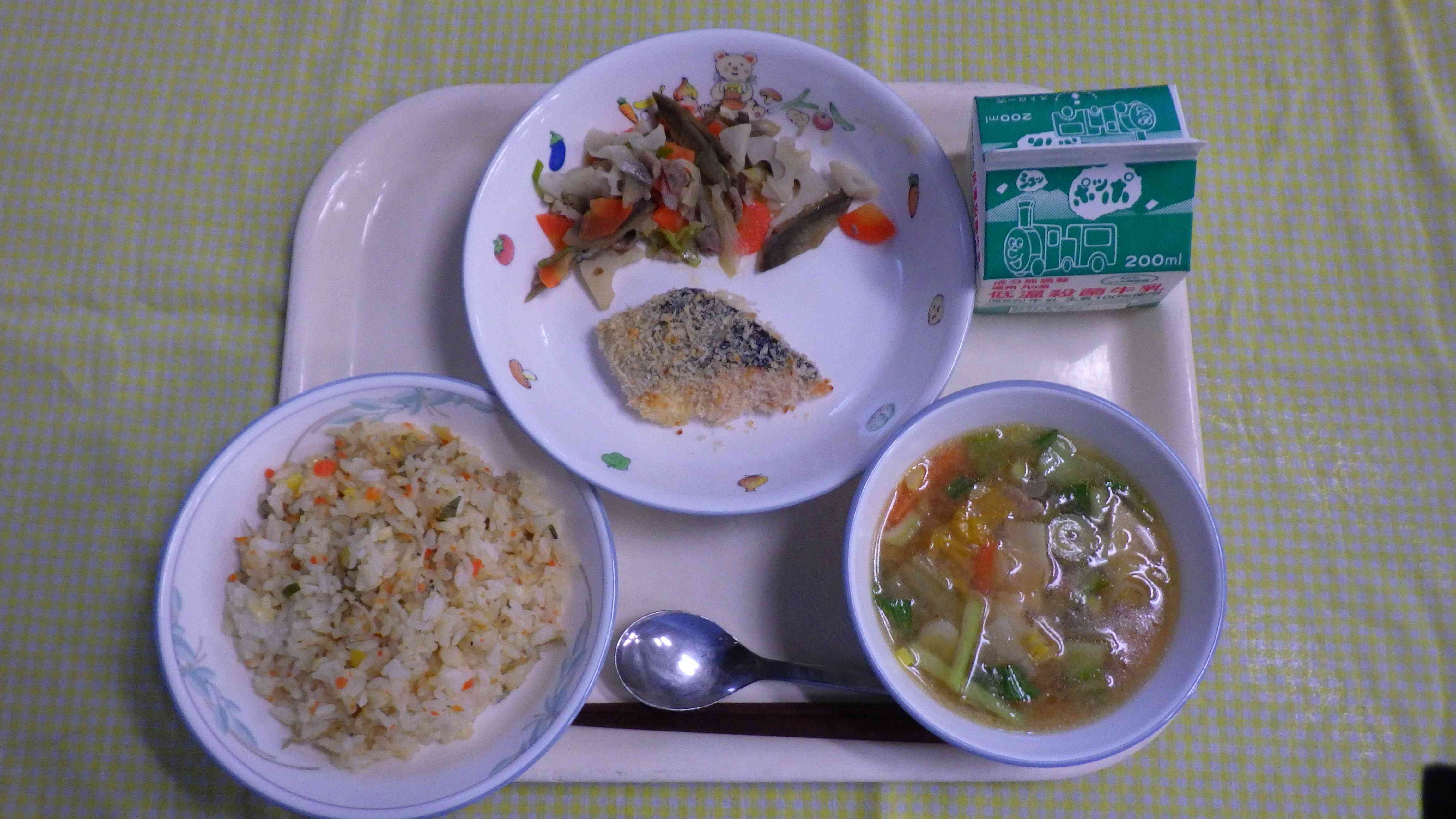 じゃこチャーハン 香りみそスープ 鮭のさざれ焼き ねぎ塩きんぴら 牛乳