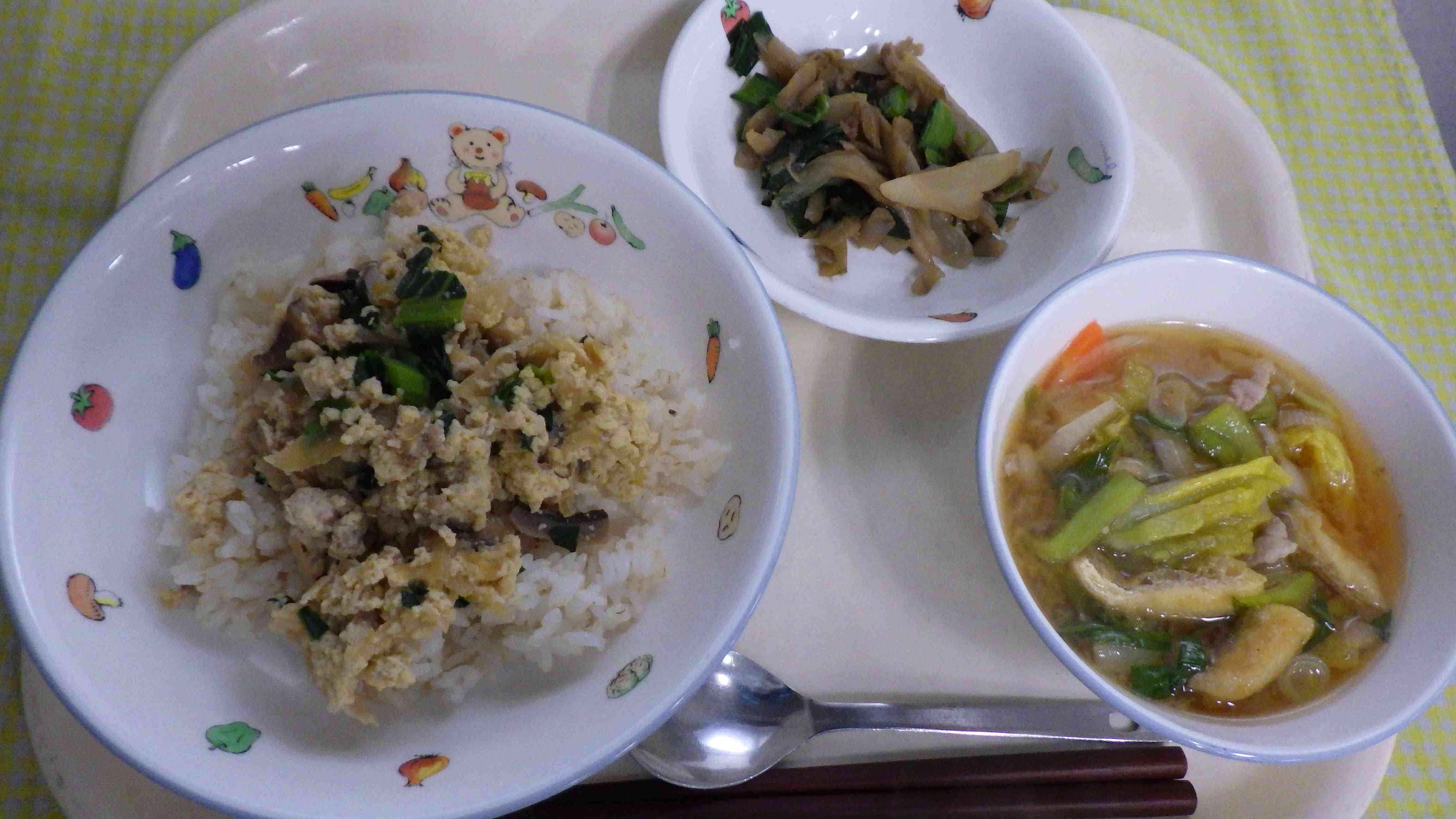 親子丼 みそ汁 うどのきんぴら 牛乳