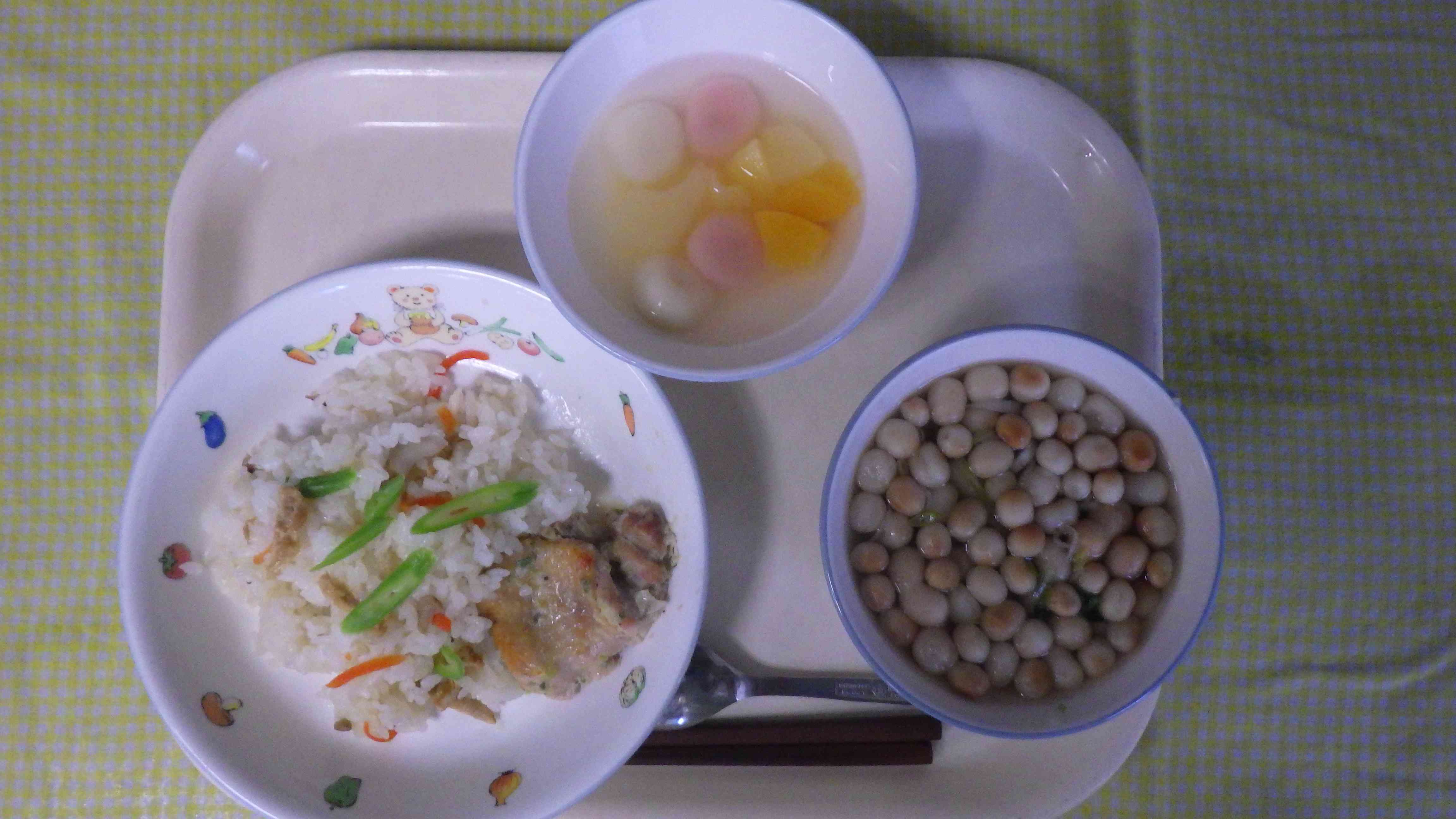 炊き込みちらし寿司 すまし汁 鶏のみそ焼き フルーツ白玉