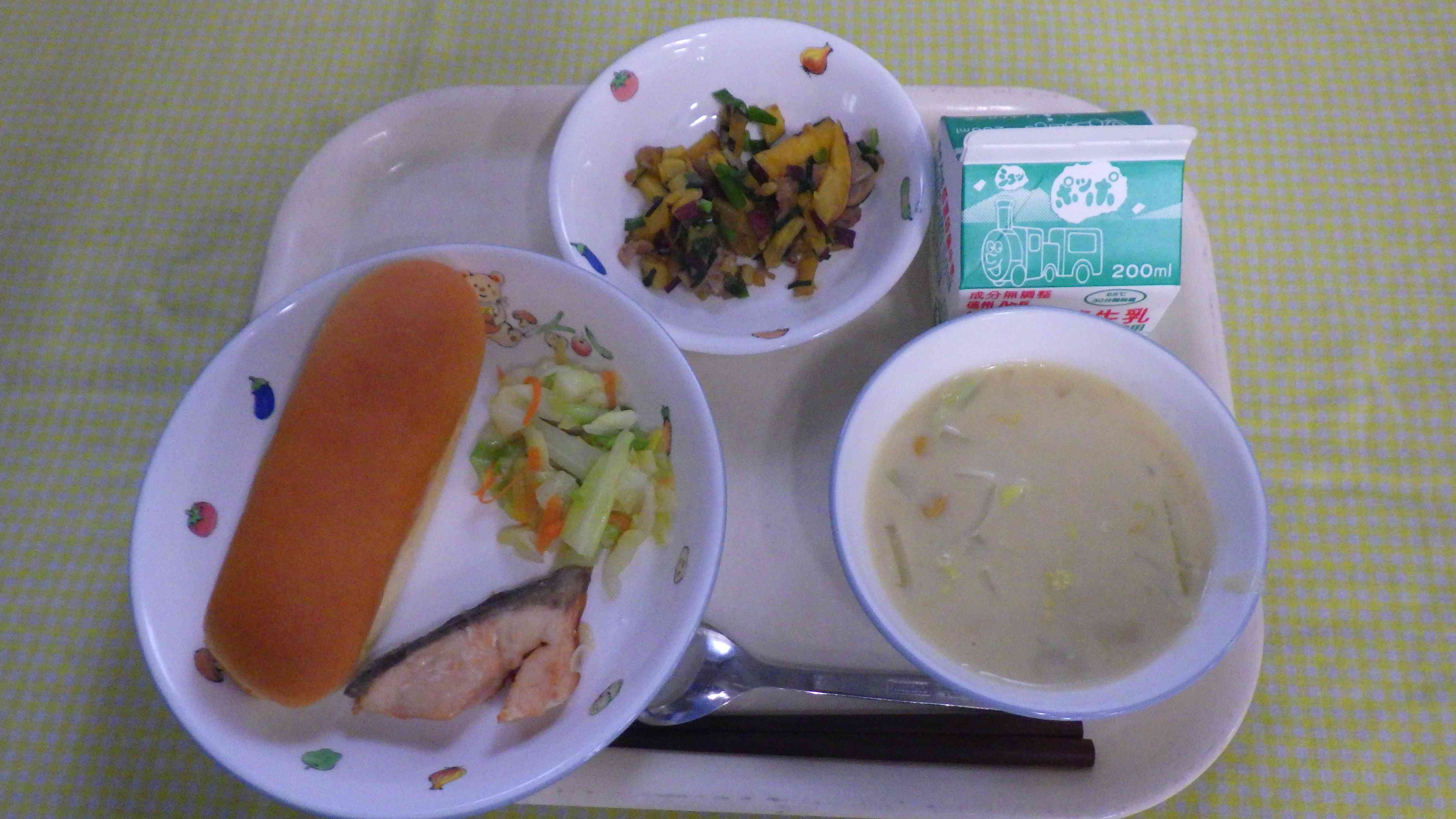 セルフサンド(パン・鮭のムニエル・キャベツソテー)コーンスープ さつま芋のピリ辛きんぴら 牛乳
