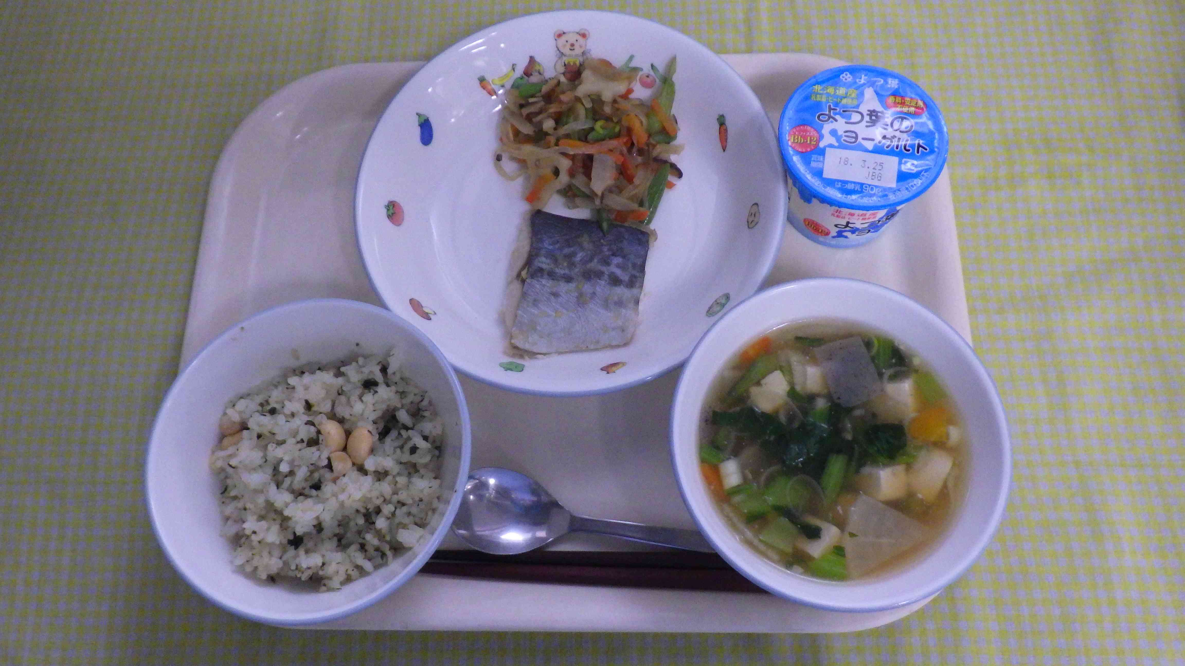 大豆とわかめのごはん のっぺい汁 鰆の塩こうじ焼き 五目きんぴら ヨーグルト