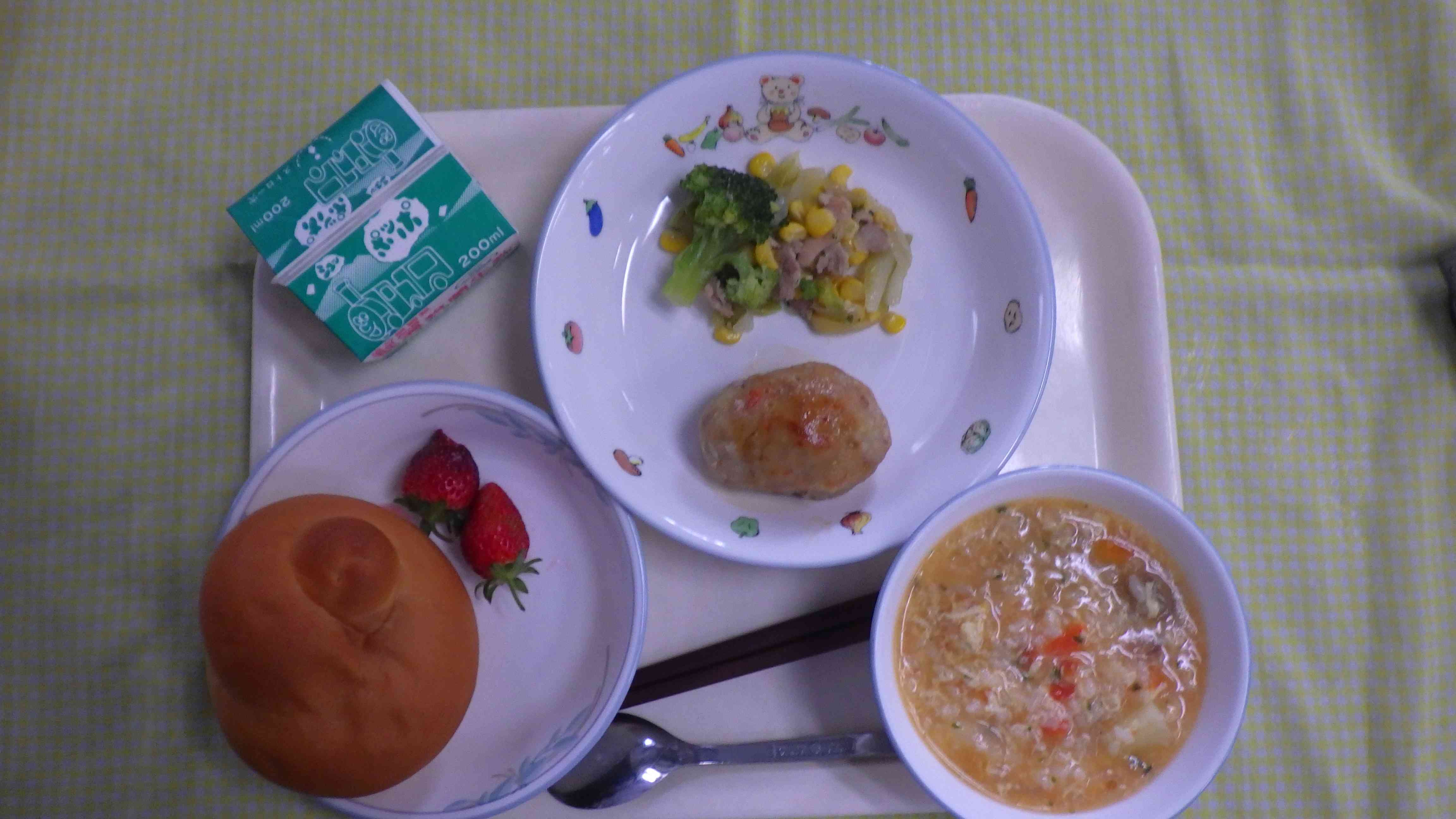ミルクパン リゾット 卵入りハンバーグ コーンと野菜のソテー いちご 牛乳