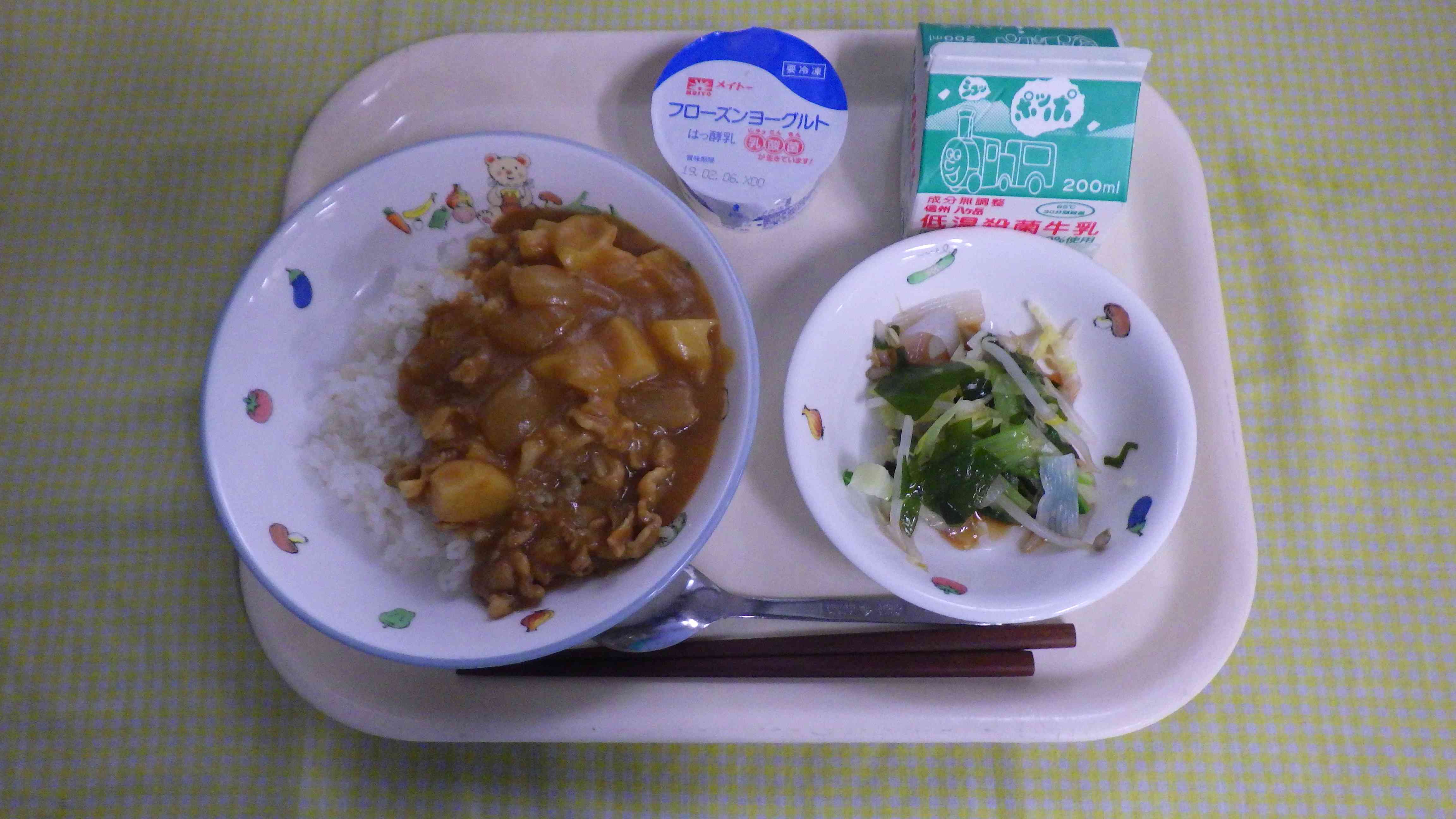 カレーライス ボイル野菜 和風ドレッシング フローズンヨーグルト 牛乳